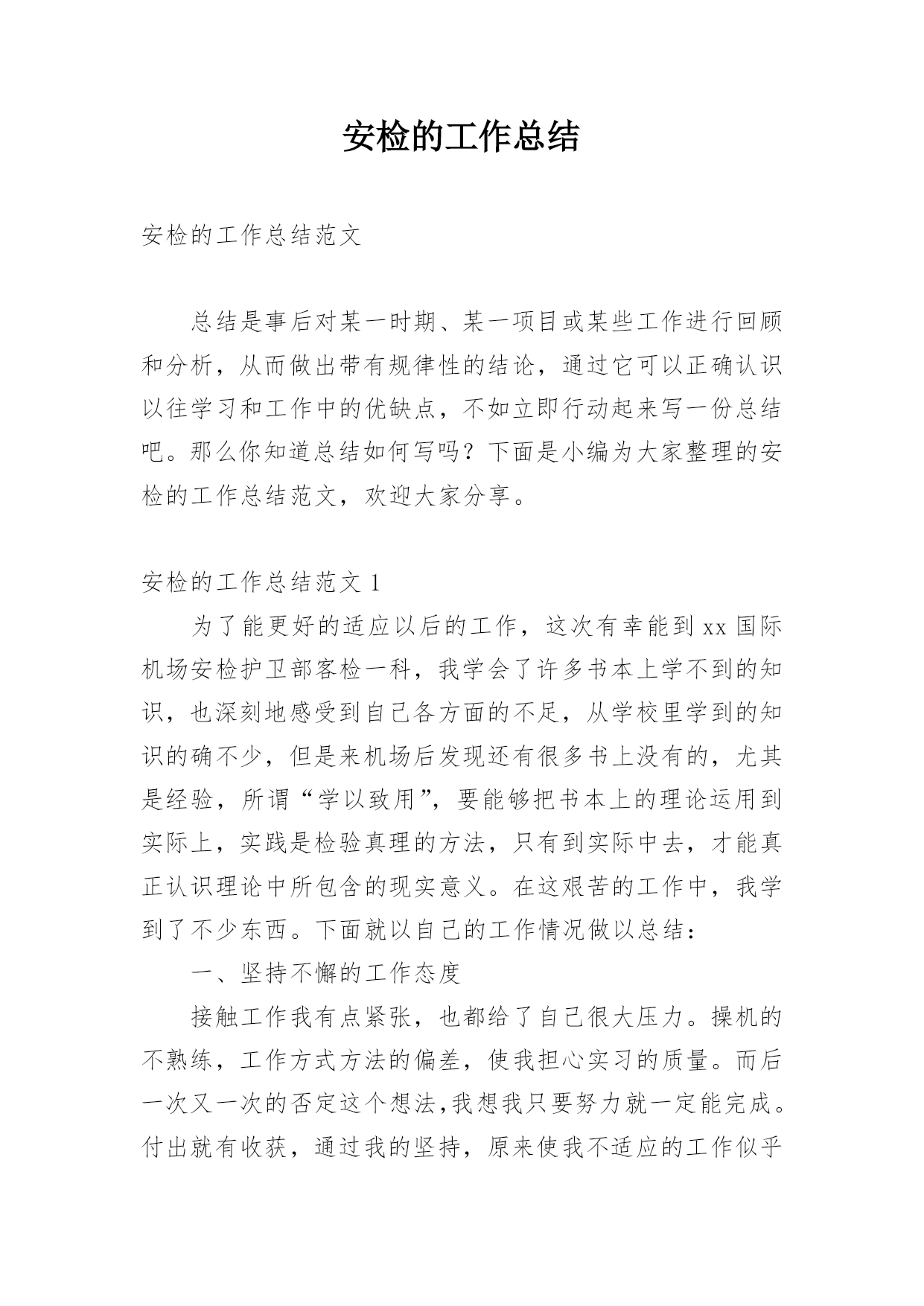 安检的工作总结安检的工作总结范文总结是事后对某一时期、某一项目或某些工作进行回顾和分析,从而做出带有规律性的结论,通过它可以正确认识以往学习和工作中的优缺点,不如立即行动起来写一份总结吧。那么你知道总结如何写吗?下面是小编为大家整理的安检的工作总结范文,欢迎大家分享。安检的工作总结范文1为了能更好的适应以后的工作,这次有幸能到xx国际机场安检护卫部客检一科,我学会了许多书本上学不到的知识,也深刻地感受到自己各方面的不足,从学校里学到的知识的确不少,但是来机场后发现还有很多书上没有的,尤其是经验,所谓“学以
