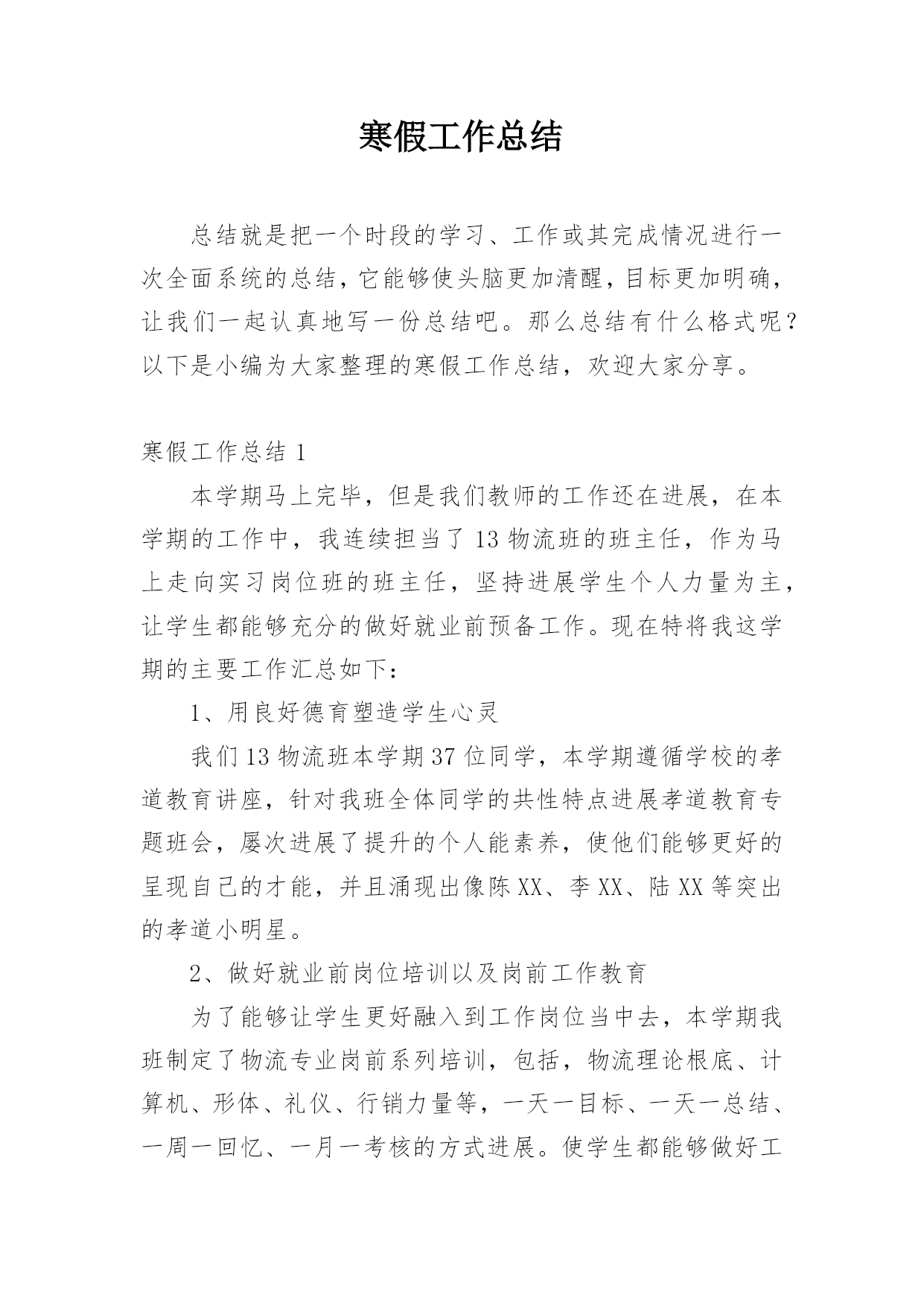 寒假工作总结总结就是把一个时段的学习、工作或其完成情况进行一次全面系统的总结,它能够使头脑更加清醒,目标更加明确,让我们一起认真地写一份总结吧。那么总结有什么格式呢?以下是小编为大家整理的寒假工作总结,欢迎大家分享。寒假工作总结1本学期马上完毕,但是我们教师的工作还在进展,在本学期的工作中,我连续担当了13物流班的班主任,作为马上走向实习岗位班的班主任,坚持进展学生个人力量为主,让学生都能够充分的做好就业前预备工作。现在特将我这学期的主要工作汇总如下:1、用良好德育塑造学生心灵我们13物流班本学期37位同