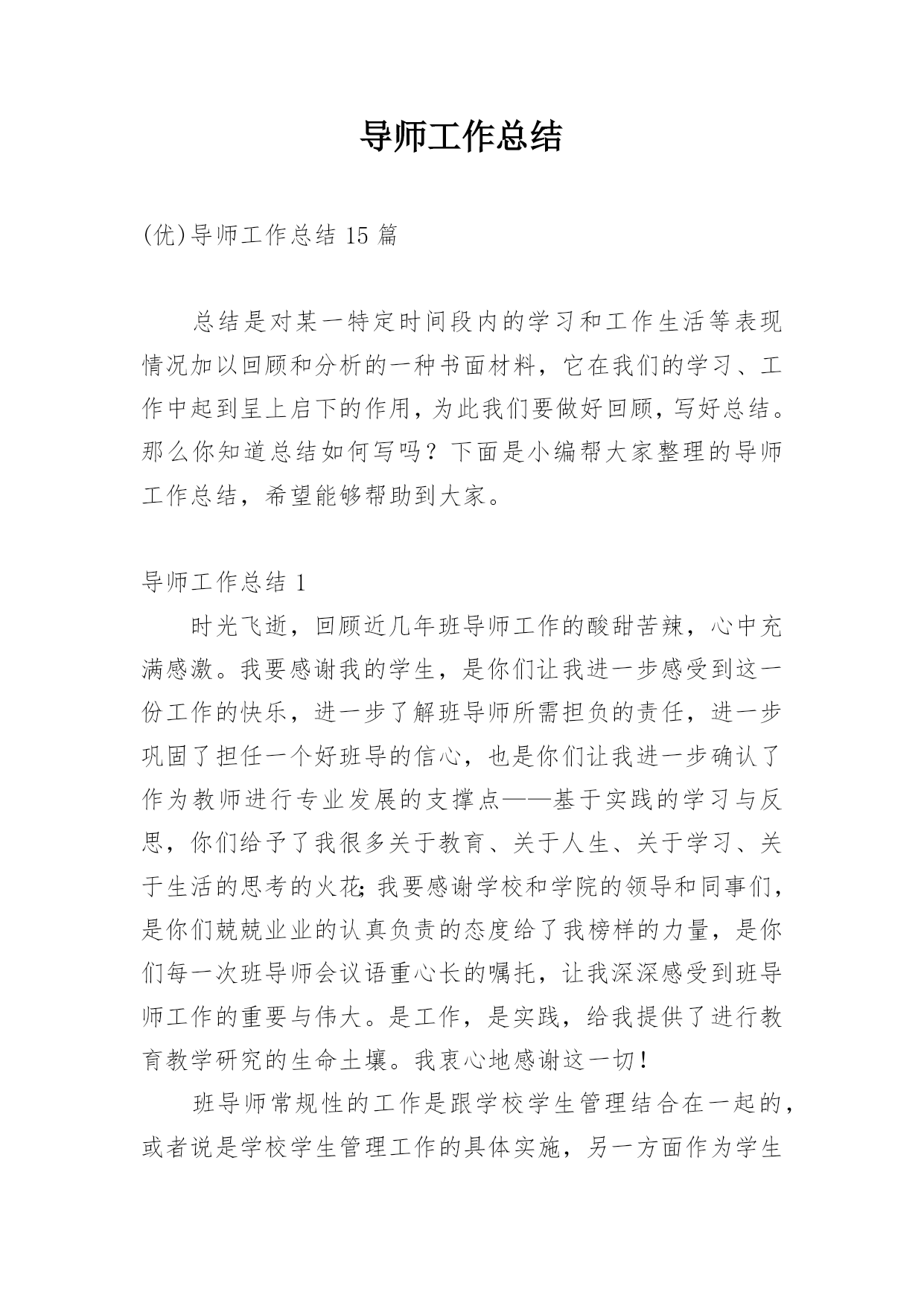 导师工作总结(优)导师工作总结15篇总结是对某一特定时间段内的学习和工作生活等表现情况加以回顾和分析的一种书面材料,它在我们的学习、工作中起到呈上启下的作用,为此我们要做好回顾,写好总结。那么你知道总结如何写吗?下面是小编帮大家整理的导师工作总结,希望能够帮助到大家。导师工作总结1时光飞逝,回顾近几年班导师工作的酸甜苦辣,心中充满感激。我要感谢我的学生,是你们让我进一步感受到这一份工作的快乐,进一步了解班导师所需担负的责任,进一步巩固了担任一个好班导的信心,也是你们让我进一步确认了作为教师进行专业发展的支