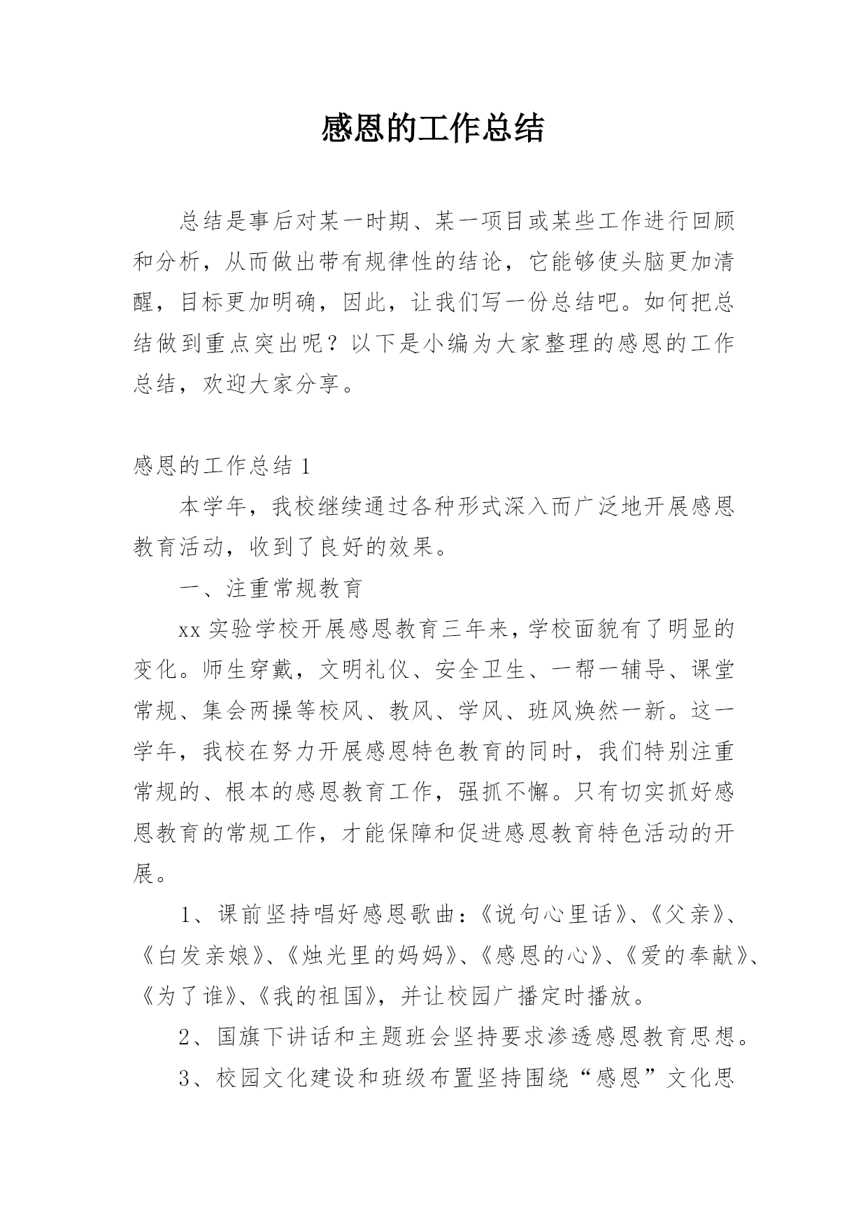 感恩的工作总结总结是事后对某一时期、某一项目或某些工作进行回顾和分析,从而做出带有规律性的结论,它能够使头脑更加清醒,目标更加明确,因此,让我们写一份总结吧。如何把总结做到重点突出呢?以下是小编为大家整理的感恩的工作总结,欢迎大家分享。感恩的工作总结1本学年,我校继续通过各种形式深入而广泛地开展感恩教育活动,收到了良好的效果。一、注重常规教育xx实验学校开展感恩教育三年来,学校面貌有了明显的变化。师生穿戴,文明礼仪、安全卫生、一帮一辅导、课堂常规、集会两操等校风、教风、学风、班风焕然一新。这一学年,我校在