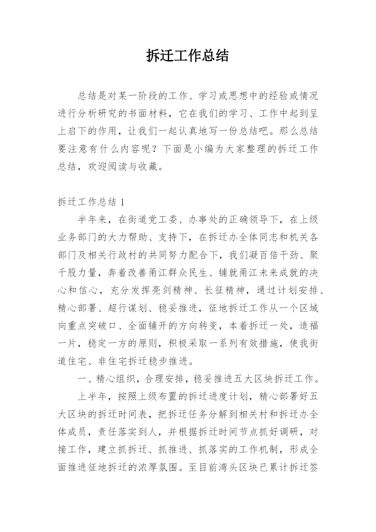 拆迁工作总结总结是对某一阶段的工作、学习或思想中的经验或情况进行分析研究的书面材料,它在我们的学习、工作中起到呈上启下的作用,让我们一起认真地写一份总结吧。那么总结要注意有什么内容呢?下面是小编为大家整理的拆迁工作总结,欢迎阅读与收藏。拆迁工作总结1半年来,在街道党工委、办事处的正确领导下,在上级业务部门的大力帮助、支持下,在拆迁办全体同志和机关各部门及相关行政村的共同努力配合下,我们凝百倍干劲、聚千股力量,奔着改善甬江群众民生、铺就甬江未来成就的决心和信心,充分发挥亮剑精神、长征精神,通过计划安排、精心