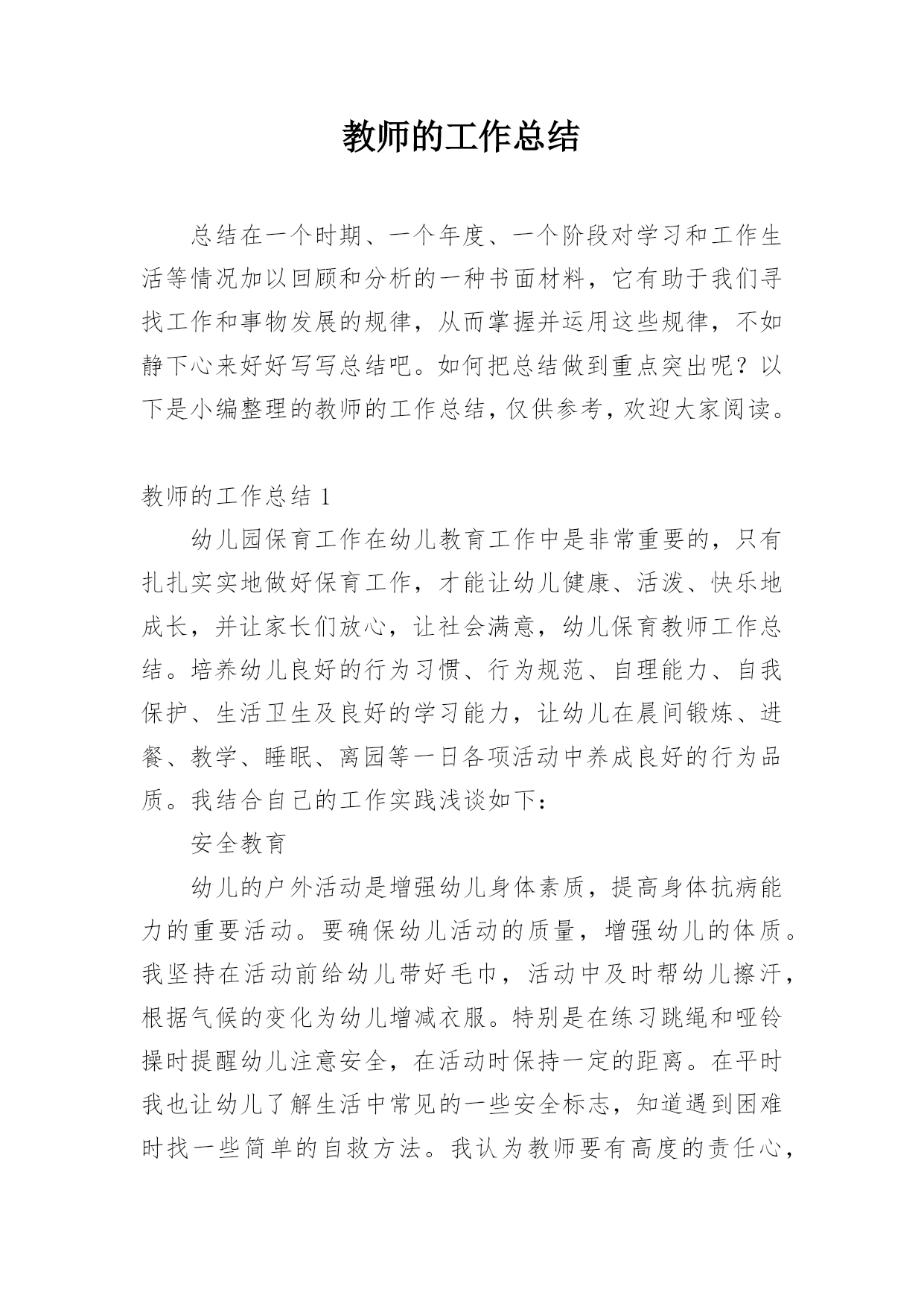教师的工作总结总结在一个时期、一个年度、一个阶段对学习和工作生活等情况加以回顾和分析的一种书面材料,它有助于我们寻找工作和事物发展的规律,从而掌握并运用这些规律,不如静下心来好好写写总结吧。如何把总结做到重点突出呢?以下是小编整理的教师的工作总结,仅供参考,欢迎大家阅读。教师的工作总结1幼儿园保育工作在幼儿教育工作中是非常重要的,只有扎扎实实地做好保育工作,才能让幼儿健康、活泼、快乐地成长,并让家长们放心,让社会满意,幼儿保育教师工作总结。培养幼儿良好的行为习惯、行为规范、自理能力、自我保护、生活卫生及良