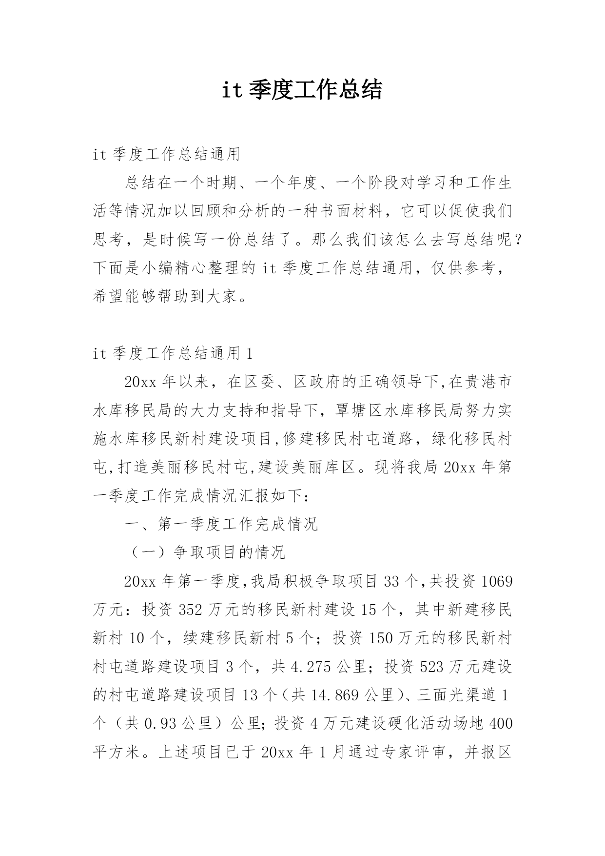 it季度工作总结it季度工作总结通用总结在一个时期、一个年度、一个阶段对学习和工作生活等情况加以回顾和分析的一种书面材料,它可以促使我们思考,是时候写一份总结了。那么我们该怎么去写总结呢?下面是小编精心整理的it季度工作总结通用,仅供参考,希望能够帮助到大家。it季度工作总结通用120xx年以来,在区委、区政府的正确领导下,在贵港市水库移民局的大力支持和指导下,覃塘区水库移民局努力实施水库移民新村建设项目,修建移民村屯道路,绿化移民村屯,打造美丽移民村屯,建设美丽库区。现将我局20xx年第一季度工作完成情