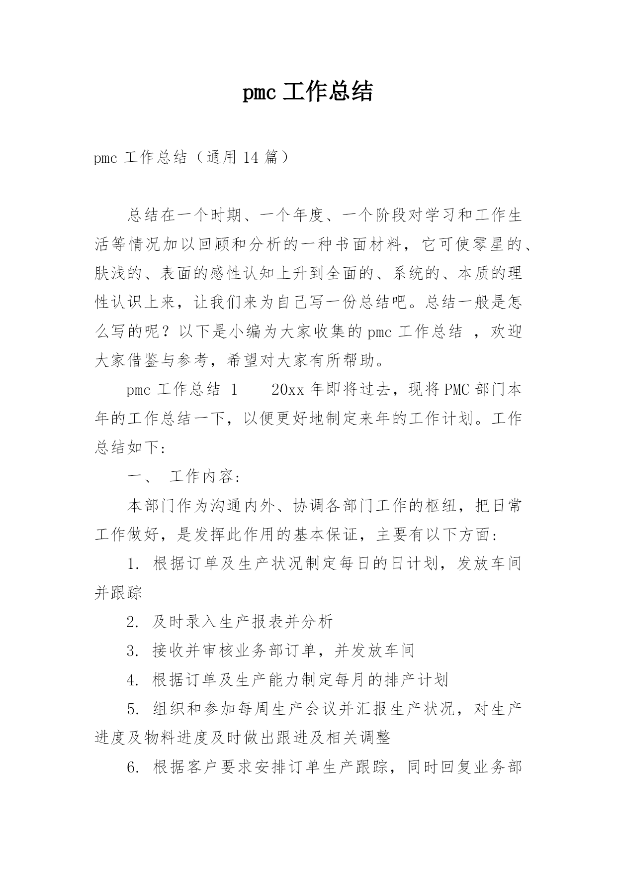 pmc工作总结pmc工作总结(通用14篇)总结在一个时期、一个年度、一个阶段对学习和工作生活等情况加以回顾和分析的一种书面材料,它可使零星的、肤浅的、表面的感性认知上升到全面的、系统的、本质的理性认识上来,让我们来为自己写一份总结吧。总结一般是怎么写的呢?以下是小编为大家收集的pmc工作总结,欢迎大家借鉴与参考,希望对大家有所帮助。pmc工作总结120xx年即将过去,现将PMC部门本年的工作总结一下,以便更好地制定来年的工作计划。工作总结如下:一、工作内容:本部门作为沟通内外、协调各部门工作的枢纽,把日常