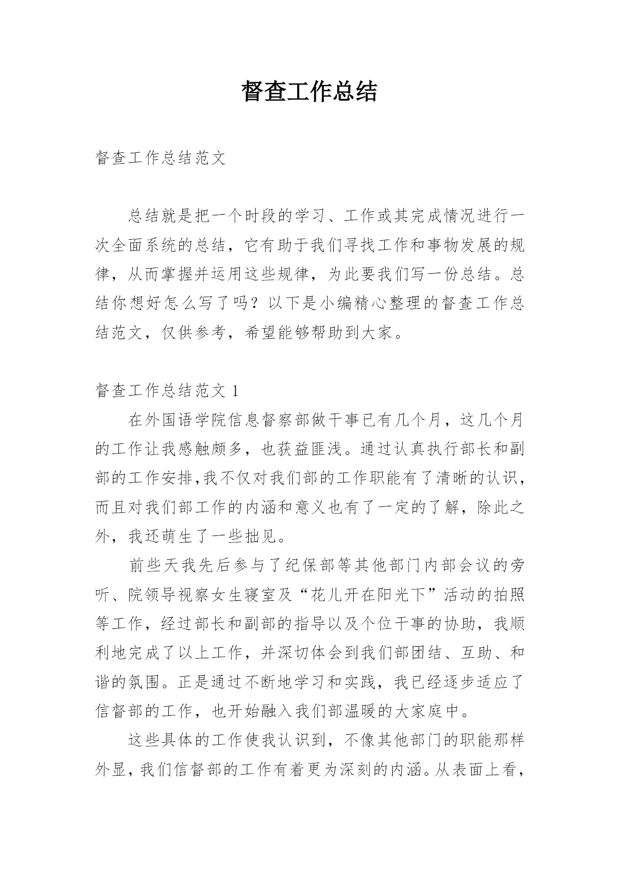 督查工作总结督查工作总结范文总结就是把一个时段的学习、工作或其完成情况进行一次全面系统的总结,它有助于我们寻找工作和事物发展的规律,从而掌握并运用这些规律,为此要我们写一份总结。总结你想好怎么写了吗?以下是小编精心整理的督查工作总结范文,仅供参考,希望能够帮助到大家。督查工作总结范文1在外国语学院信息督察部做干事已有几个月,这几个月的工作让我感触颇多,也获益匪浅。通过认真执行部长和副部的工作安排,我不仅对我们部的工作职能有了清晰的认识,而且对我们部工作的内涵和意义也有了一定的了解,除此之外,我还萌生了一些