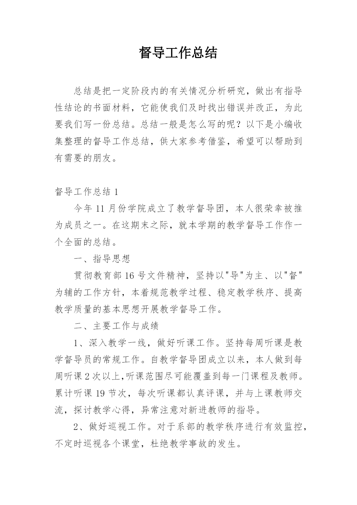 督导工作总结总结是把一定阶段内的有关情况分析研究,做出有指导性结论的书面材料,它能使我们及时找出错误并改正,为此要我们写一份总结。总结一般是怎么写的呢?以下是小编收集整理的督导工作总结,供大家参考借鉴,希望可以帮助到有需要的朋友。督导工作总结1今年11月份学院成立了教学督导团,本人很荣幸被推为成员之一。在这期末之际,就本学期的教学督导工作作一个全面的总结。一、指导思想贯彻教育部16号文件精神,坚持以"导"为主、以"督"为辅的工作方针,本着规范教学过程、稳定教学秩序、提高教学质量的基本思想开展教学督导工作。