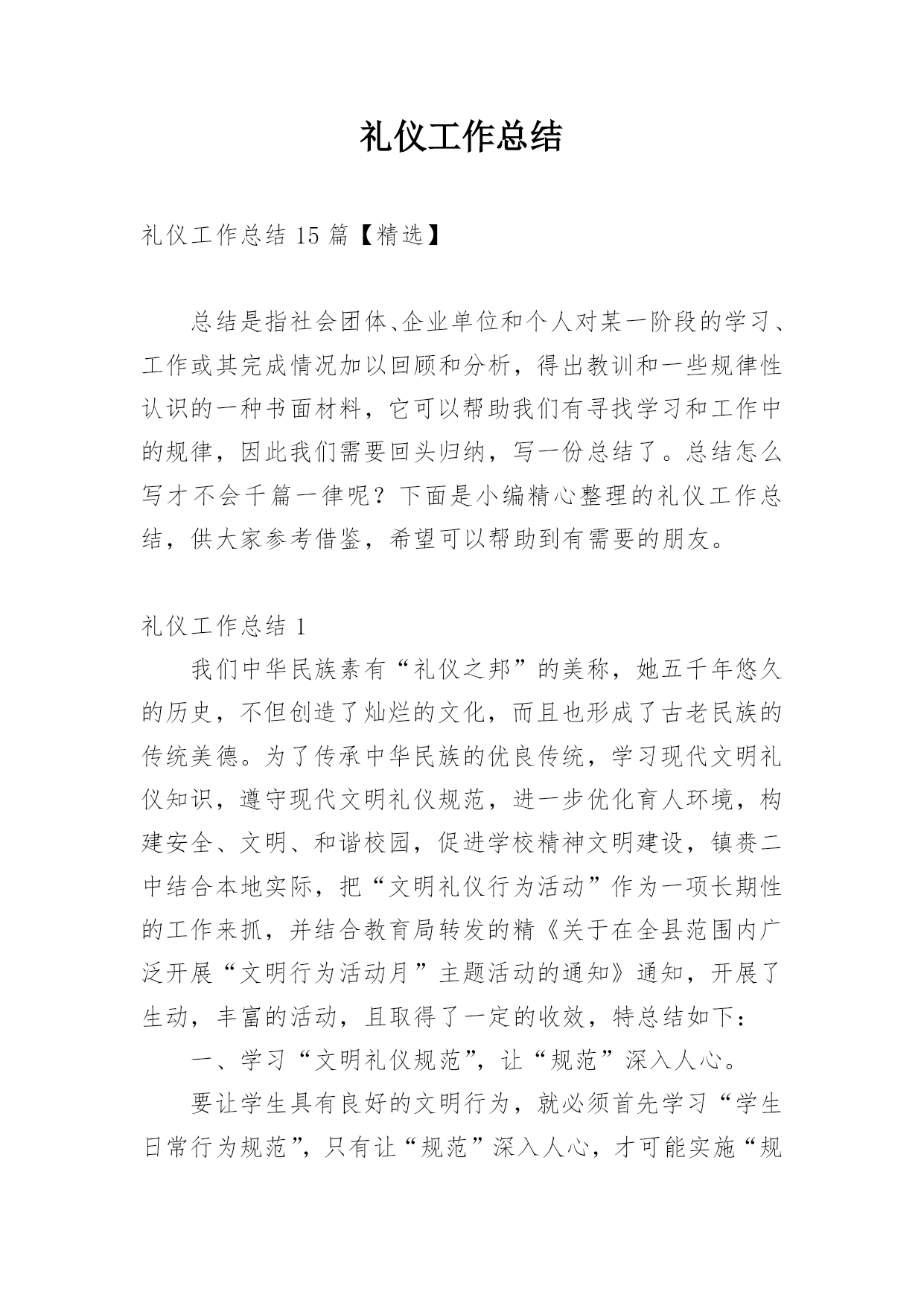 礼仪工作总结礼仪工作总结15篇【精选】总结是指社会团体、企业单位和个人对某一阶段的学习、工作或其完成情况加以回顾和分析,得出教训和一些规律性认识的一种书面材料,它可以帮助我们有寻找学习和工作中的规律,因此我们需要回头归纳,写一份总结了。总结怎么写才不会千篇一律呢?下面是小编精心整理的礼仪工作总结,供大家参考借鉴,希望可以帮助到有需要的朋友。礼仪工作总结1我们中华民族素有“礼仪之邦”的美称,她五千年悠久的历史,不但创造了灿烂的文化,而且也形成了古老民族的传统美德。为了传承中华民族的优良传统,学习现代文明礼仪