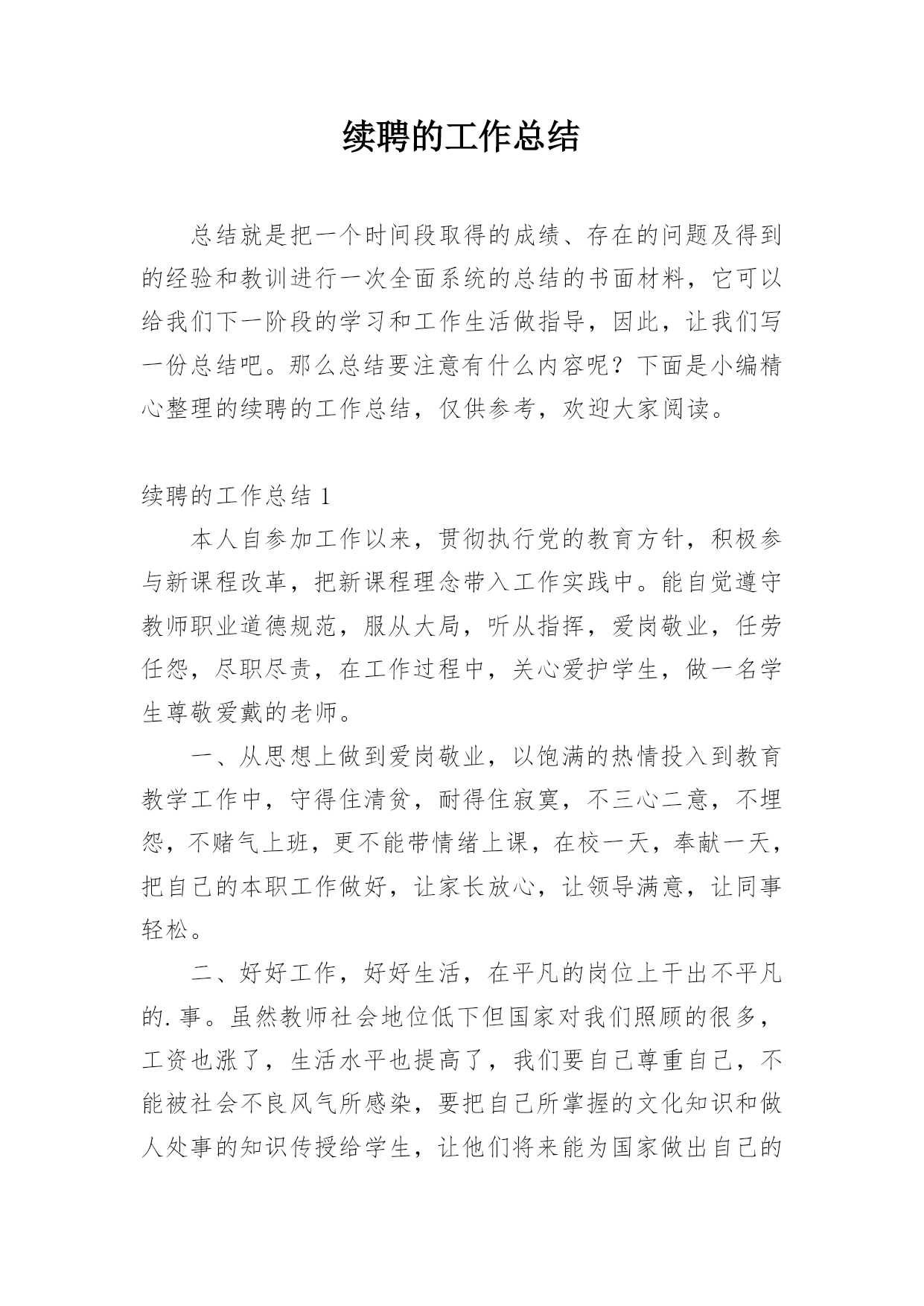 续聘的工作总结总结就是把一个时间段取得的成绩、存在的问题及得到的经验和教训进行一次全面系统的总结的书面材料,它可以给我们下一阶段的学习和工作生活做指导,因此,让我们写一份总结吧。那么总结要注意有什么内容呢?下面是小编精心整理的续聘的工作总结,仅供参考,欢迎大家阅读。续聘的工作总结1本人自参加工作以来,贯彻执行党的教育方针,积极参与新课程改革,把新课程理念带入工作实践中。能自觉遵守教师职业道德规范,服从大局,听从指挥,爱岗敬业,任劳任怨,尽职尽责,在工作过程中,关心爱护学生,做一名学生尊敬爱戴的老师。一、从