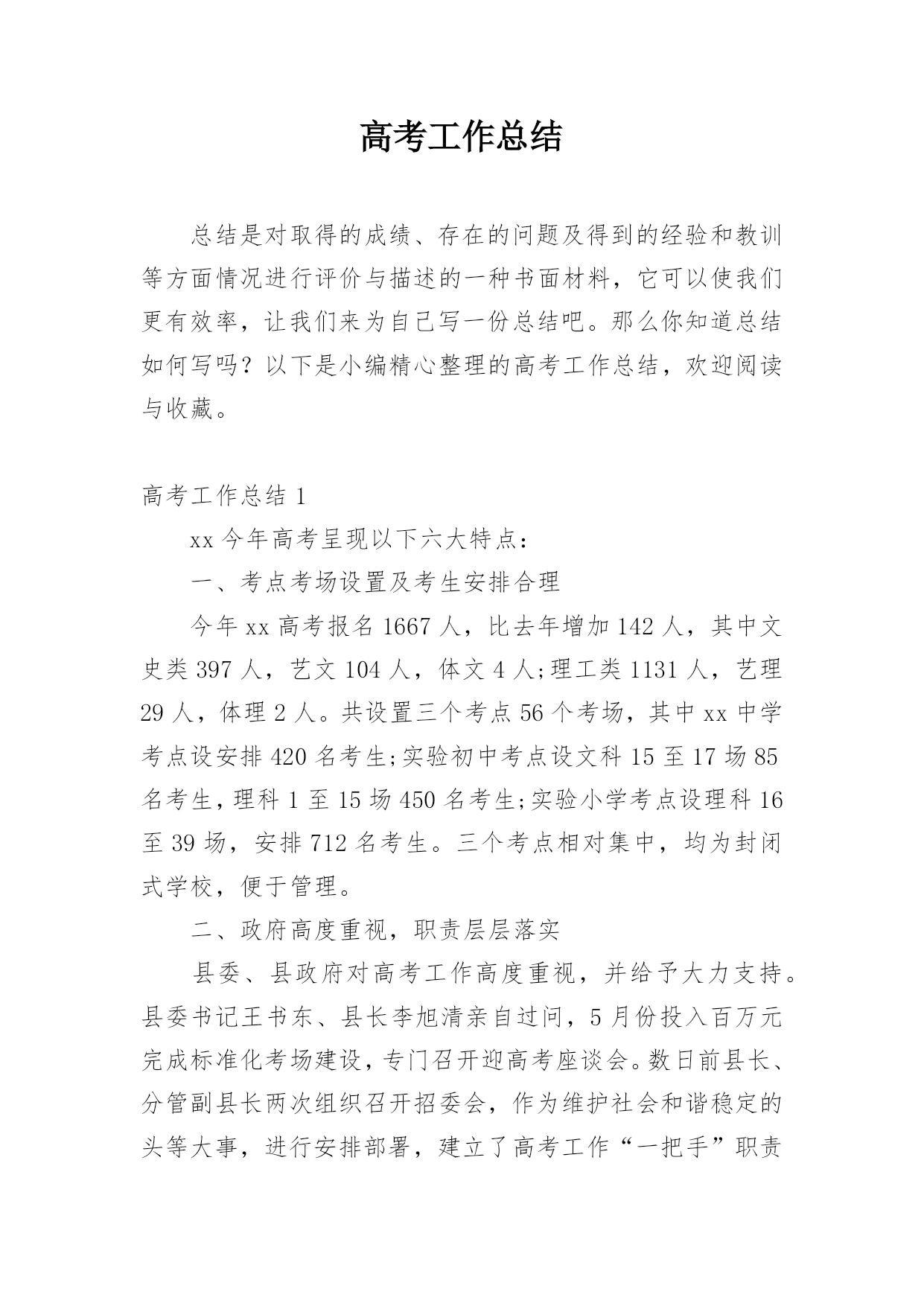 高考工作总结总结是对取得的成绩、存在的问题及得到的经验和教训等方面情况进行评价与描述的一种书面材料,它可以使我们更有效率,让我们来为自己写一份总结吧。那么你知道总结如何写吗?以下是小编精心整理的高考工作总结,欢迎阅读与收藏。高考工作总结1xx今年高考呈现以下六大特点:一、考点考场设置及考生安排合理今年xx高考报名1667人,比去年增加142人,其中文史类397人,艺文104人,体文4人;理工类1131人,艺理29人,体理2人。共设置三个考点56个考场,其中xx中学考点设安排420名考生;实验初中考点设文科