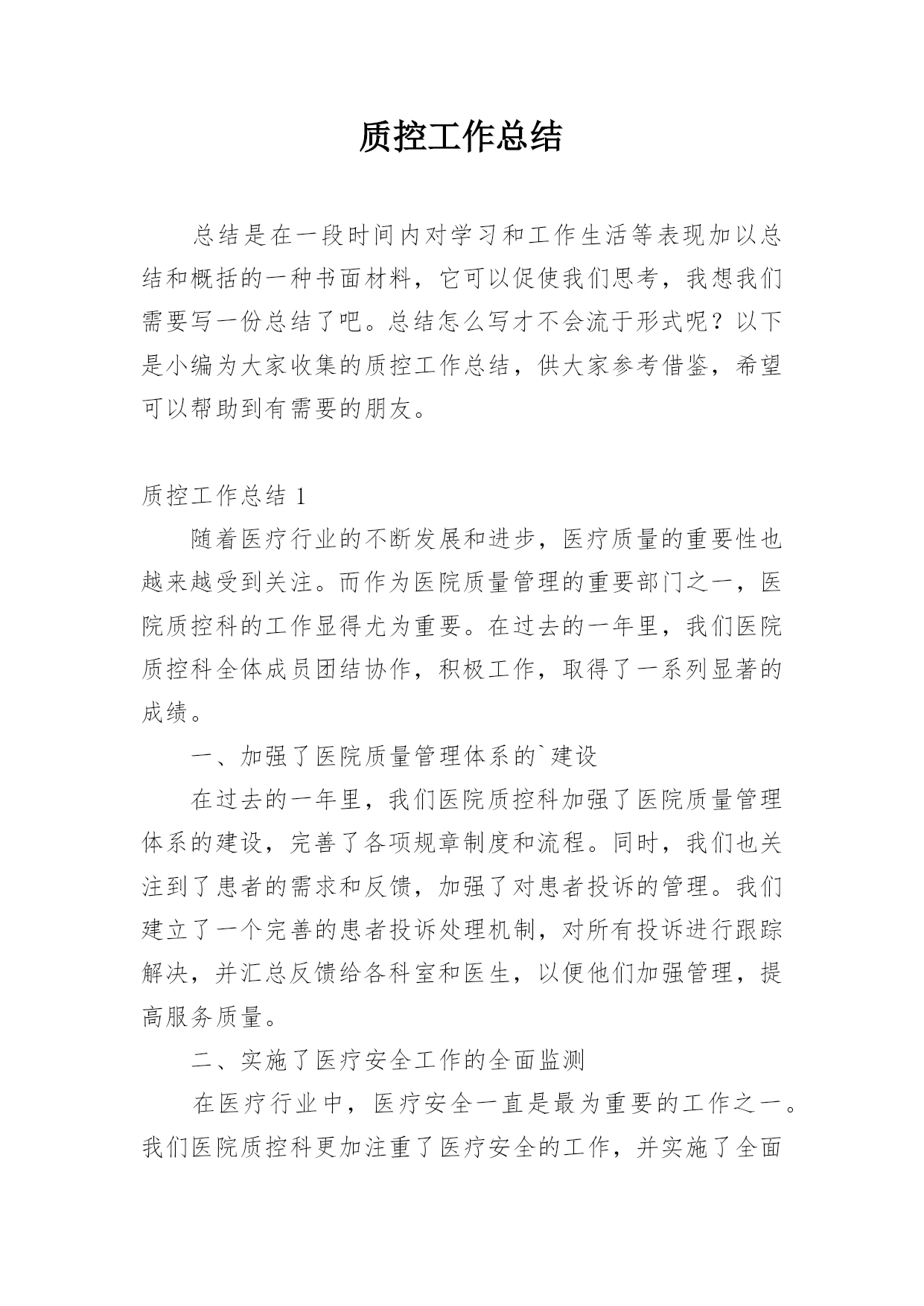 质控工作总结总结是在一段时间内对学习和工作生活等表现加以总结和概括的一种书面材料,它可以促使我们思考,我想我们需要写一份总结了吧。总结怎么写才不会流于形式呢?以下是小编为大家收集的质控工作总结,供大家参考借鉴,希望可以帮助到有需要的朋友。质控工作总结1随着医疗行业的不断发展和进步,医疗质量的重要性也越来越受到关注。而作为医院质量管理的重要部门之一,医院质控科的工作显得尤为重要。在过去的一年里,我们医院质控科全体成员团结协作,积极工作,取得了一系列显著的成绩。一、加强了医院质量管理体系的`建设在过去的一年里
