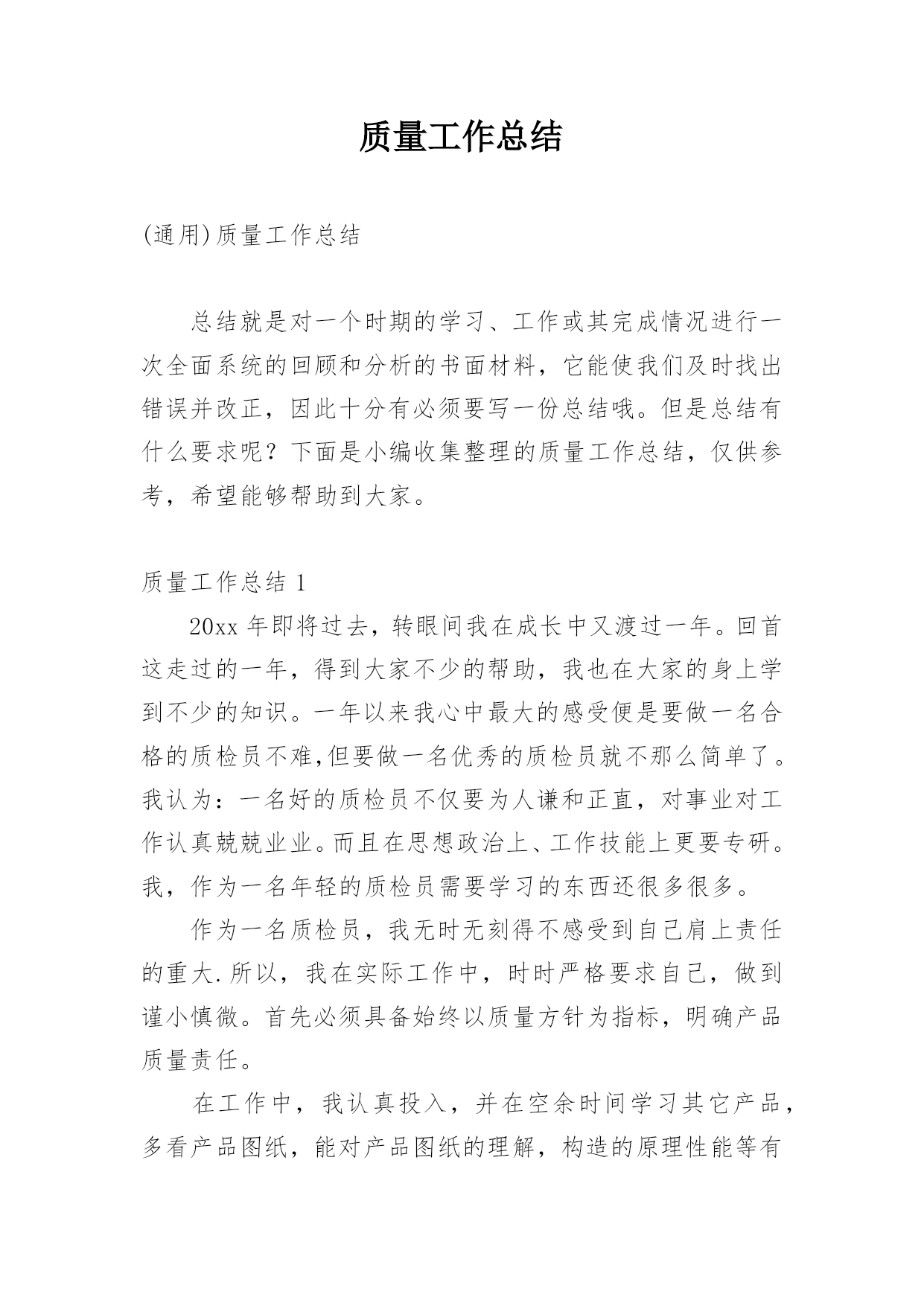 质量工作总结(通用)质量工作总结总结就是对一个时期的学习、工作或其完成情况进行一次全面系统的回顾和分析的书面材料,它能使我们及时找出错误并改正,因此十分有必须要写一份总结哦。但是总结有什么要求呢?下面是小编收集整理的质量工作总结,仅供参考,希望能够帮助到大家。质量工作总结120xx年即将过去,转眼间我在成长中又渡过一年。回首这走过的一年,得到大家不少的帮助,我也在大家的身上学到不少的知识。一年以来我心中最大的感受便是要做一名合格的质检员不难,但要做一名优秀的质检员就不那么简单了。我认为:一名好的质检员不仅
