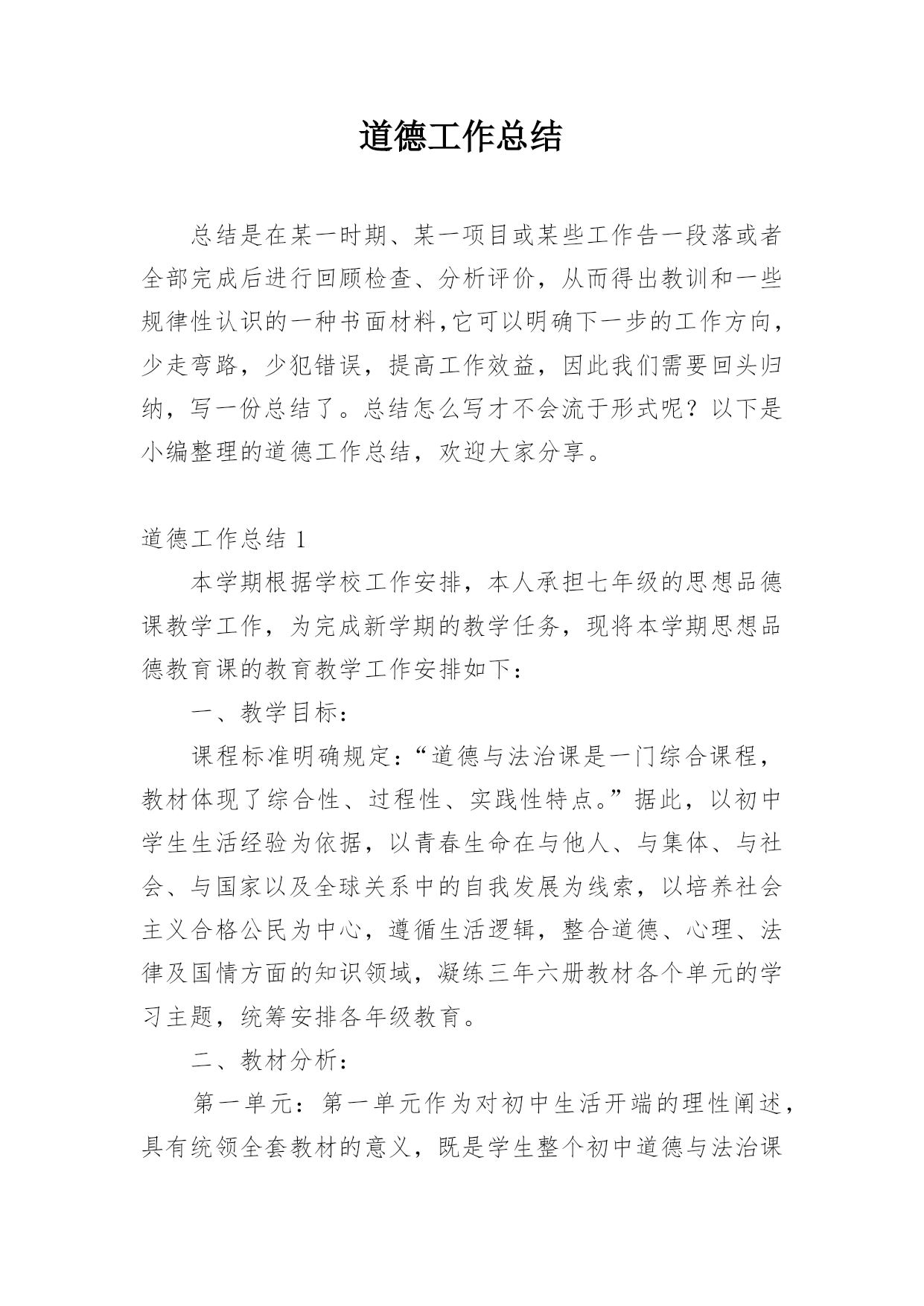 道德工作总结总结是在某一时期、某一项目或某些工作告一段落或者全部完成后进行回顾检查、分析评价,从而得出教训和一些规律性认识的一种书面材料,它可以明确下一步的工作方向,少走弯路,少犯错误,提高工作效益,因此我们需要回头归纳,写一份总结了。总结怎么写才不会流于形式呢?以下是小编整理的道德工作总结,欢迎大家分享。道德工作总结1本学期根据学校工作安排,本人承担七年级的思想品德课教学工作,为完成新学期的教学任务,现将本学期思想品德教育课的教育教学工作安排如下:一、教学目标:课程标准明确规定:“道德与法治课是一门综合