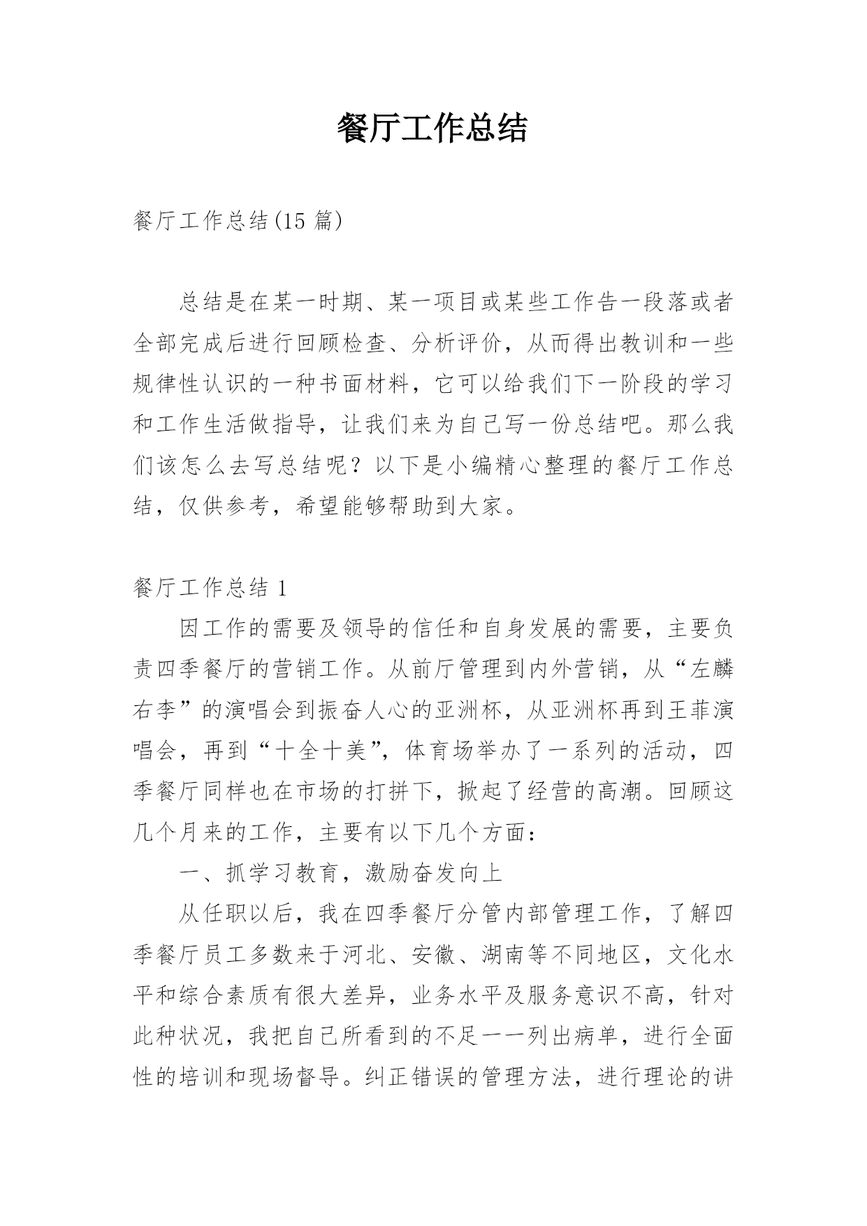 餐厅工作总结餐厅工作总结(15篇)总结是在某一时期、某一项目或某些工作告一段落或者全部完成后进行回顾检查、分析评价,从而得出教训和一些规律性认识的一种书面材料,它可以给我们下一阶段的学习和工作生活做指导,让我们来为自己写一份总结吧。那么我们该怎么去写总结呢?以下是小编精心整理的餐厅工作总结,仅供参考,希望能够帮助到大家。餐厅工作总结1因工作的需要及领导的信任和自身发展的需要,主要负责四季餐厅的营销工作。从前厅管理到内外营销,从“左麟右李”的演唱会到振奋人心的亚洲杯,从亚洲杯再到王菲演唱会,再到“十全十美”