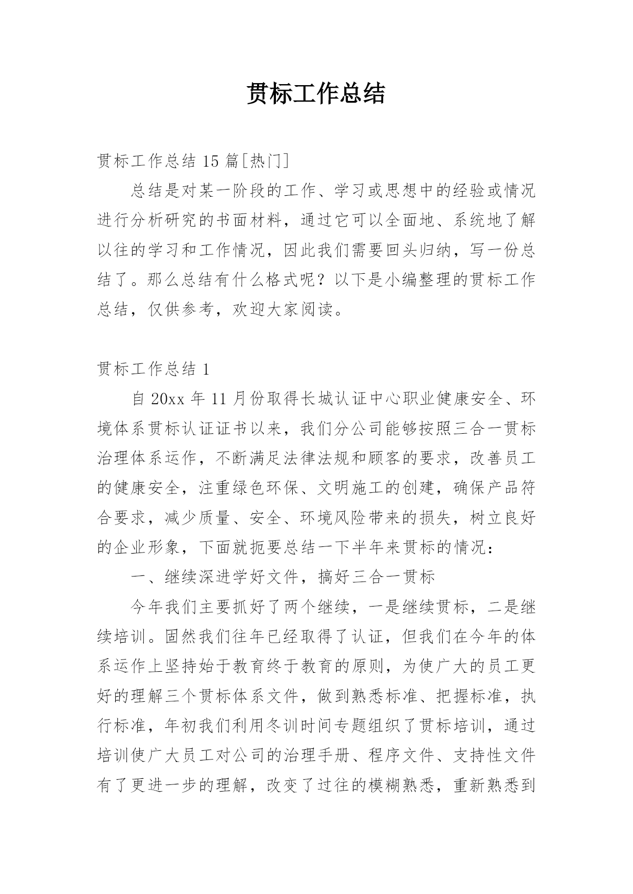 贯标工作总结贯标工作总结15篇[热门]总结是对某一阶段的工作、学习或思想中的经验或情况进行分析研究的书面材料,通过它可以全面地、系统地了解以往的学习和工作情况,因此我们需要回头归纳,写一份总结了。那么总结有什么格式呢?以下是小编整理的贯标工作总结,仅供参考,欢迎大家阅读。贯标工作总结1自20xx年11月份取得长城认证中心职业健康安全、环境体系贯标认证证书以来,我们分公司能够按照三合一贯标治理体系运作,不断满足法律法规和顾客的要求,改善员工的健康安全,注重绿色环保、文明施工的创建,确保产品符合要求,减少质量