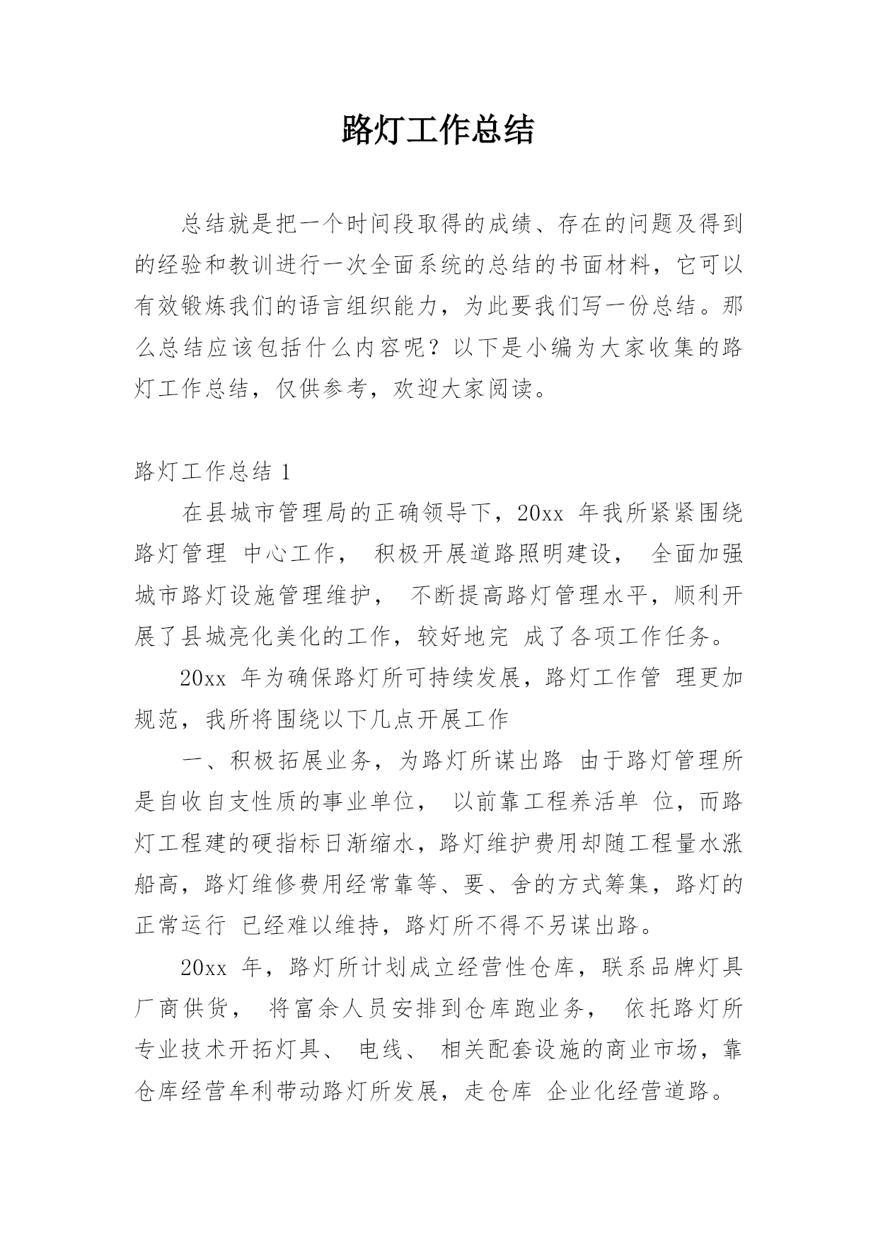 路灯工作总结总结就是把一个时间段取得的成绩、存在的问题及得到的经验和教训进行一次全面系统的总结的书面材料,它可以有效锻炼我们的语言组织能力,为此要我们写一份总结。那么总结应该包括什么内容呢?以下是小编为大家收集的路灯工作总结,仅供参考,欢迎大家阅读。路灯工作总结1在县城市管理局的正确领导下,20xx年我所紧紧围绕路灯管理中心工作,积极开展道路照明建设,全面加强城市路灯设施管理维护,不断提高路灯管理水平,顺利开展了县城亮化美化的工作,较好地完成了各项工作任务。20xx年为确保路灯所可持续发展,路灯工作管理更