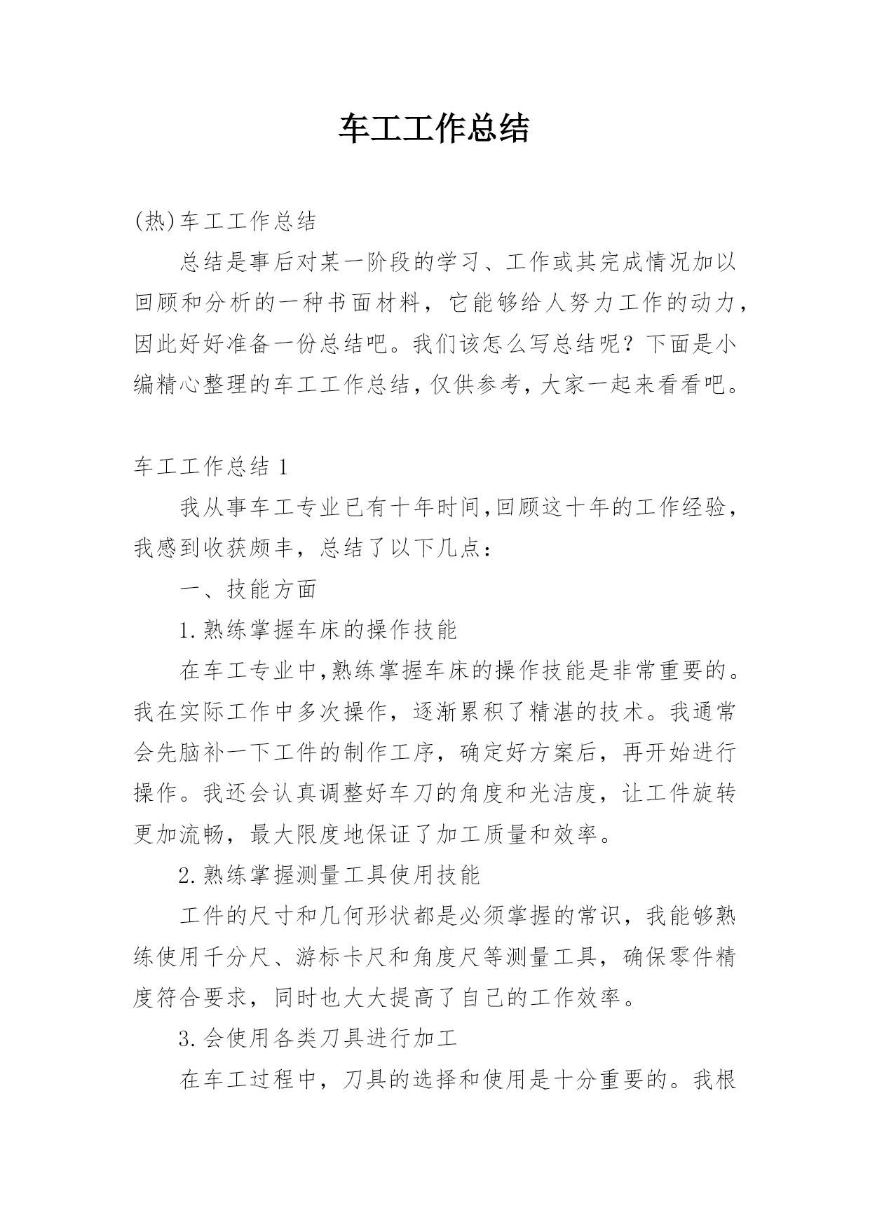 车工工作总结(热)车工工作总结总结是事后对某一阶段的学习、工作或其完成情况加以回顾和分析的一种书面材料,它能够给人努力工作的动力,因此好好准备一份总结吧。我们该怎么写总结呢?下面是小编精心整理的车工工作总结,仅供参考,大家一起来看看吧。车工工作总结1我从事车工专业已有十年时间,回顾这十年的工作经验,我感到收获颇丰,总结了以下几点:一、技能方面1.熟练掌握车床的操作技能在车工专业中,熟练掌握车床的操作技能是非常重要的。我在实际工作中多次操作,逐渐累积了精湛的技术。我通常会先脑补一下工件的制作工序,确定好方案