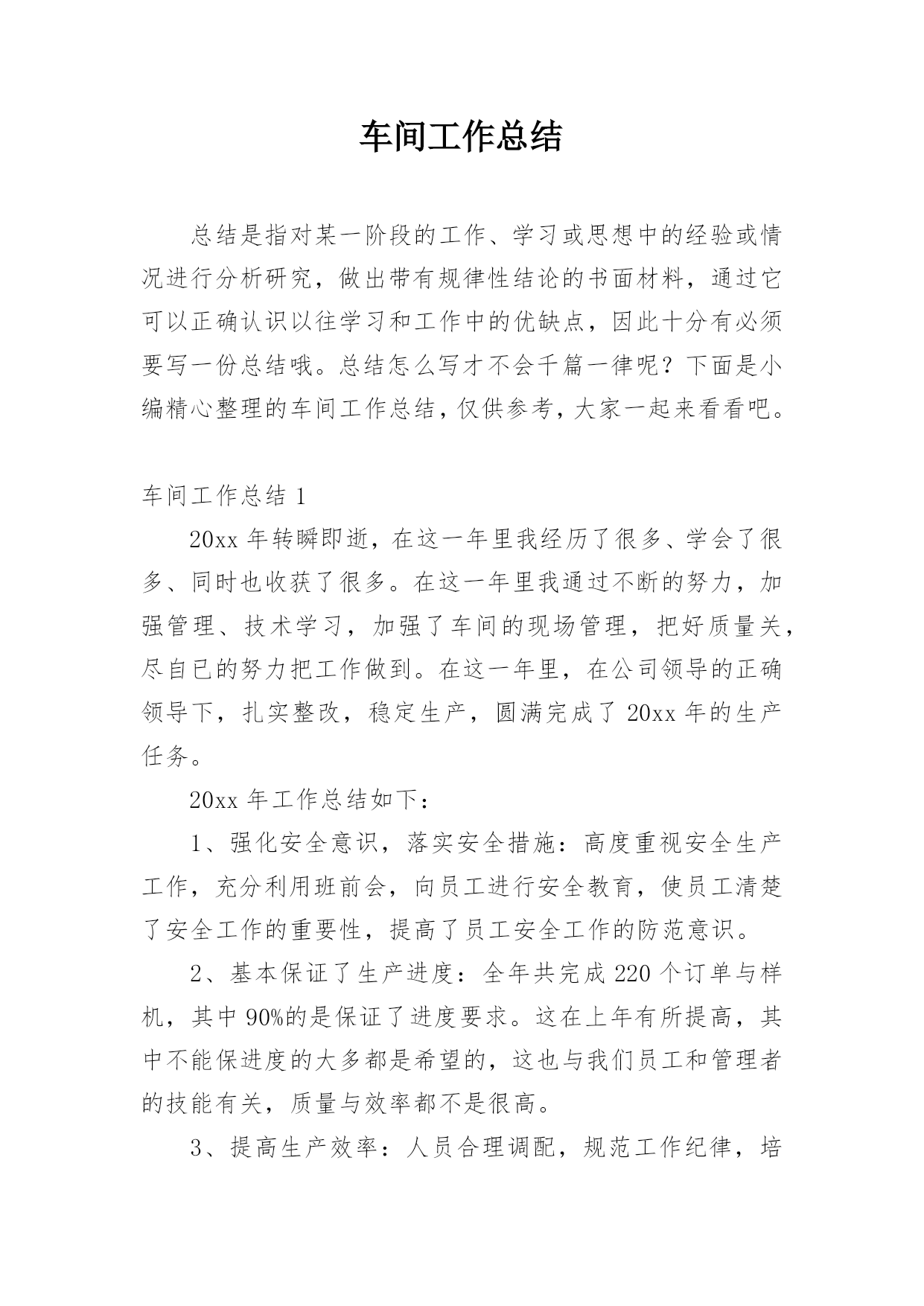 车间工作总结总结是指对某一阶段的工作、学习或思想中的经验或情况进行分析研究,做出带有规律性结论的书面材料,通过它可以正确认识以往学习和工作中的优缺点,因此十分有必须要写一份总结哦。总结怎么写才不会千篇一律呢?下面是小编精心整理的车间工作总结,仅供参考,大家一起来看看吧。车间工作总结120xx年转瞬即逝,在这一年里我经历了很多、学会了很多、同时也收获了很多。在这一年里我通过不断的努力,加强管理、技术学习,加强了车间的现场管理,把好质量关,尽自已的努力把工作做到。在这一年里,在公司领导的正确领导下,扎实整改,