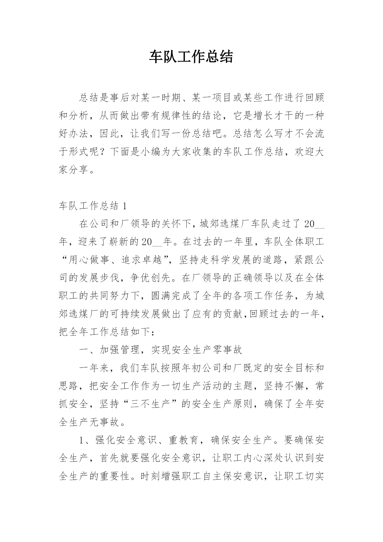 车队工作总结总结是事后对某一时期、某一项目或某些工作进行回顾和分析,从而做出带有规律性的结论,它是增长才干的一种好办法,因此,让我们写一份总结吧。总结怎么写才不会流于形式呢?下面是小编为大家收集的车队工作总结,欢迎大家分享。车队工作总结1在公司和厂领导的关怀下,城郊选煤厂车队走过了20__年,迎来了崭新的20__年。在过去的一年里,车队全体职工“用心做事、追求卓越”,坚持走科学发展的道路,紧跟公司的发展步伐,争优创先。在厂领导的正确领导以及在全体职工的共同努力下,圆满完成了全年的各项工作任务,为城郊选煤厂