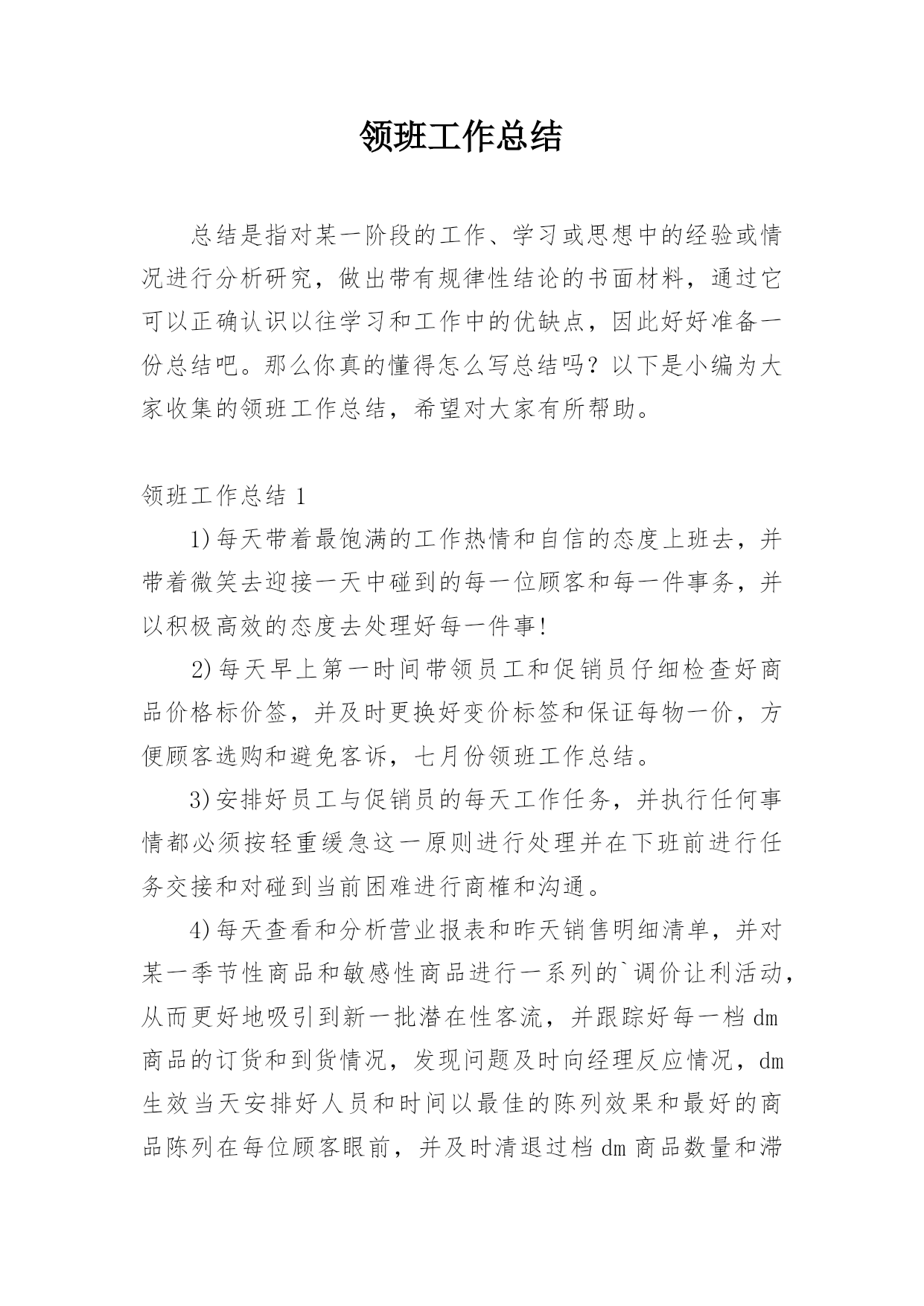 领班工作总结总结是指对某一阶段的工作、学习或思想中的经验或情况进行分析研究,做出带有规律性结论的书面材料,通过它可以正确认识以往学习和工作中的优缺点,因此好好准备一份总结吧。那么你真的懂得怎么写总结吗?以下是小编为大家收集的领班工作总结,希望对大家有所帮助。领班工作总结11)每天带着最饱满的工作热情和自信的态度上班去,并带着微笑去迎接一天中碰到的每一位顾客和每一件事务,并以积极高效的态度去处理好每一件事!2)每天早上第一时间带领员工和促销员仔细检查好商品价格标价签,并及时更换好变价标签和保证每物一价,方便