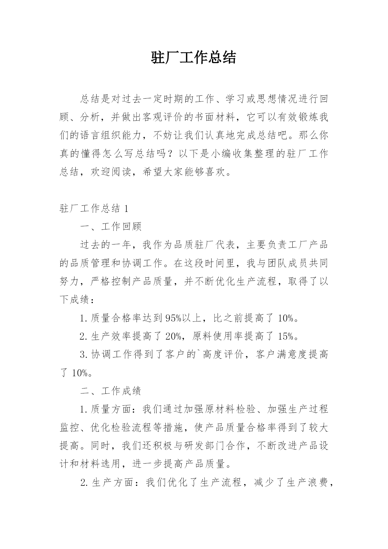 驻厂工作总结总结是对过去一定时期的工作、学习或思想情况进行回顾、分析,并做出客观评价的书面材料,它可以有效锻炼我们的语言组织能力,不妨让我们认真地完成总结吧。那么你真的懂得怎么写总结吗?以下是小编收集整理的驻厂工作总结,欢迎阅读,希望大家能够喜欢。驻厂工作总结1一、工作回顾过去的一年,我作为品质驻厂代表,主要负责工厂产品的品质管理和协调工作。在这段时间里,我与团队成员共同努力,严格控制产品质量,并不断优化生产流程,取得了以下成绩:1.质量合格率达到95%以上,比之前提高了10%。2.生产效率提高了20%,