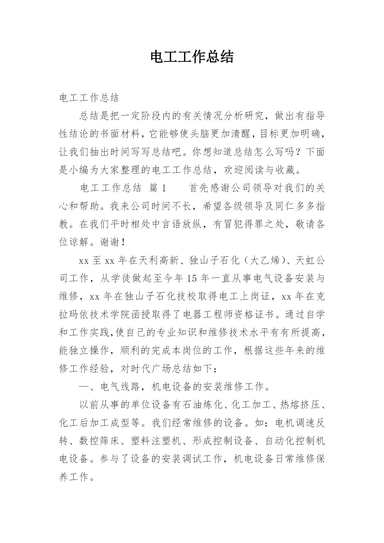 电工工作总结电工工作总结总结是把一定阶段内的有关情况分析研究,做出有指导性结论的书面材料,它能够使头脑更加清醒,目标更加明确,让我们抽出时间写写总结吧。你想知道总结怎么写吗?下面是小编为大家整理的电工工作总结,欢迎阅读与收藏。电工工作总结篇1首先感谢公司领导对我们的关心和帮助。我来公司时间不长,希望各级领导及同仁多多指教。在我们平时相处中言语放纵,有冒犯得罪之处,敬请各位谅解。谢谢!xx至xx年在天利高新、独山子石化(大乙烯)、天虹公司工作,从学徒做起至今年15年一直从事电气设备安装与维修,xx年在独山子