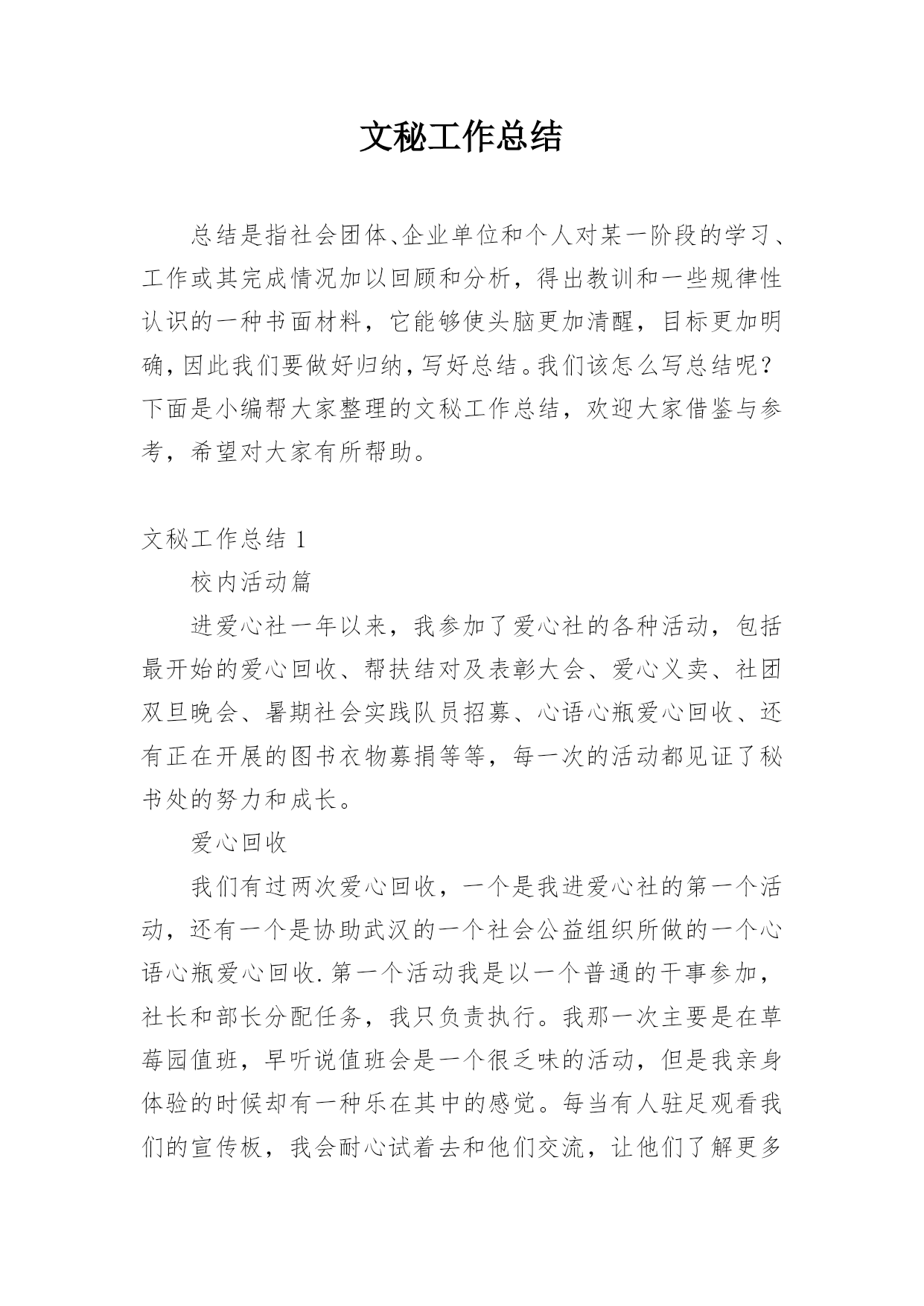 文秘工作总结总结是指社会团体、企业单位和个人对某一阶段的学习、工作或其完成情况加以回顾和分析,得出教训和一些规律性认识的一种书面材料,它能够使头脑更加清醒,目标更加明确,因此我们要做好归纳,写好总结。我们该怎么写总结呢?下面是小编帮大家整理的文秘工作总结,欢迎大家借鉴与参考,希望对大家有所帮助。文秘工作总结1校内活动篇进爱心社一年以来,我参加了爱心社的各种活动,包括最开始的爱心回收、帮扶结对及表彰大会、爱心义卖、社团双旦晚会、暑期社会实践队员招募、心语心瓶爱心回收、还有正在开展的图书衣物募捐等等,每一次的