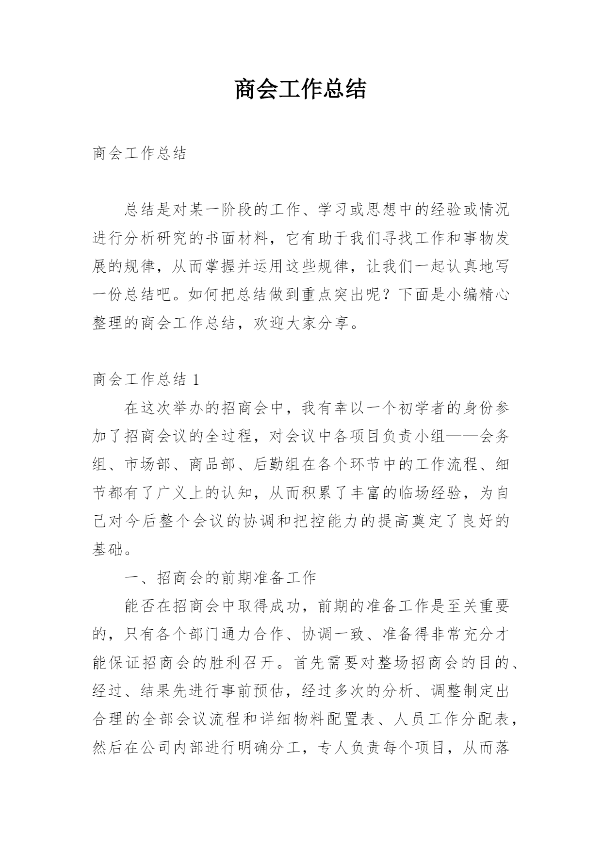 商会工作总结商会工作总结总结是对某一阶段的工作、学习或思想中的经验或情况进行分析研究的书面材料,它有助于我们寻找工作和事物发展的规律,从而掌握并运用这些规律,让我们一起认真地写一份总结吧。如何把总结做到重点突出呢?下面是小编精心整理的商会工作总结,欢迎大家分享。商会工作总结1在这次举办的招商会中,我有幸以一个初学者的身份参加了招商会议的全过程,对会议中各项目负责小组——会务组、市场部、商品部、后勤组在各个环节中的工作流程、细节都有了广义上的认知,从而积累了丰富的临场经验,为自己对今后整个会议的协调和把控能