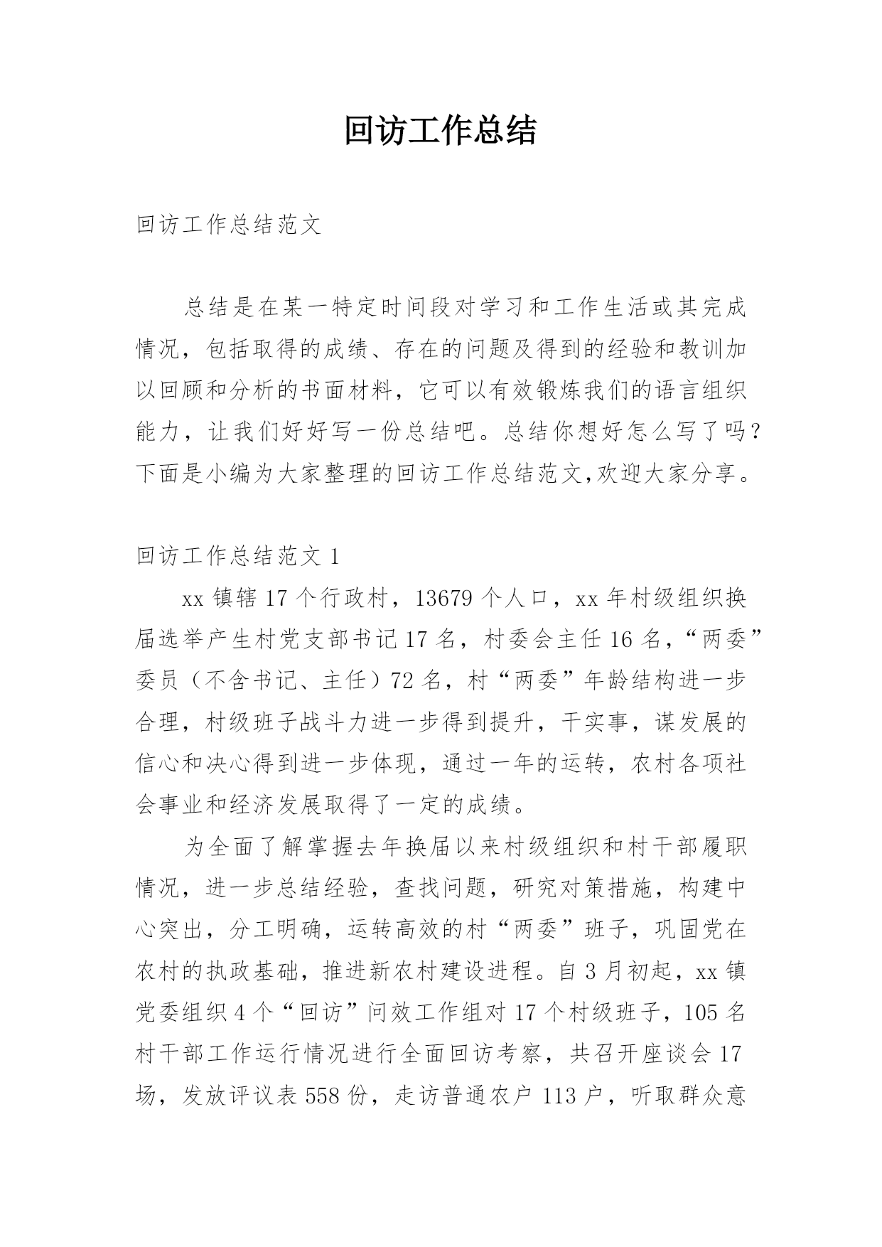 回访工作总结回访工作总结范文总结是在某一特定时间段对学习和工作生活或其完成情况,包括取得的成绩、存在的问题及得到的经验和教训加以回顾和分析的书面材料,它可以有效锻炼我们的语言组织能力,让我们好好写一份总结吧。总结你想好怎么写了吗?下面是小编为大家整理的回访工作总结范文,欢迎大家分享。回访工作总结范文1xx镇辖17个行政村,13679个人口,xx年村级组织换届选举产生村党支部书记17名,村委会主任16名,“两委”委员(不含书记、主任)72名,村“两委”年龄结构进一步合理,村级班子战斗力进一步得到提升,干实事