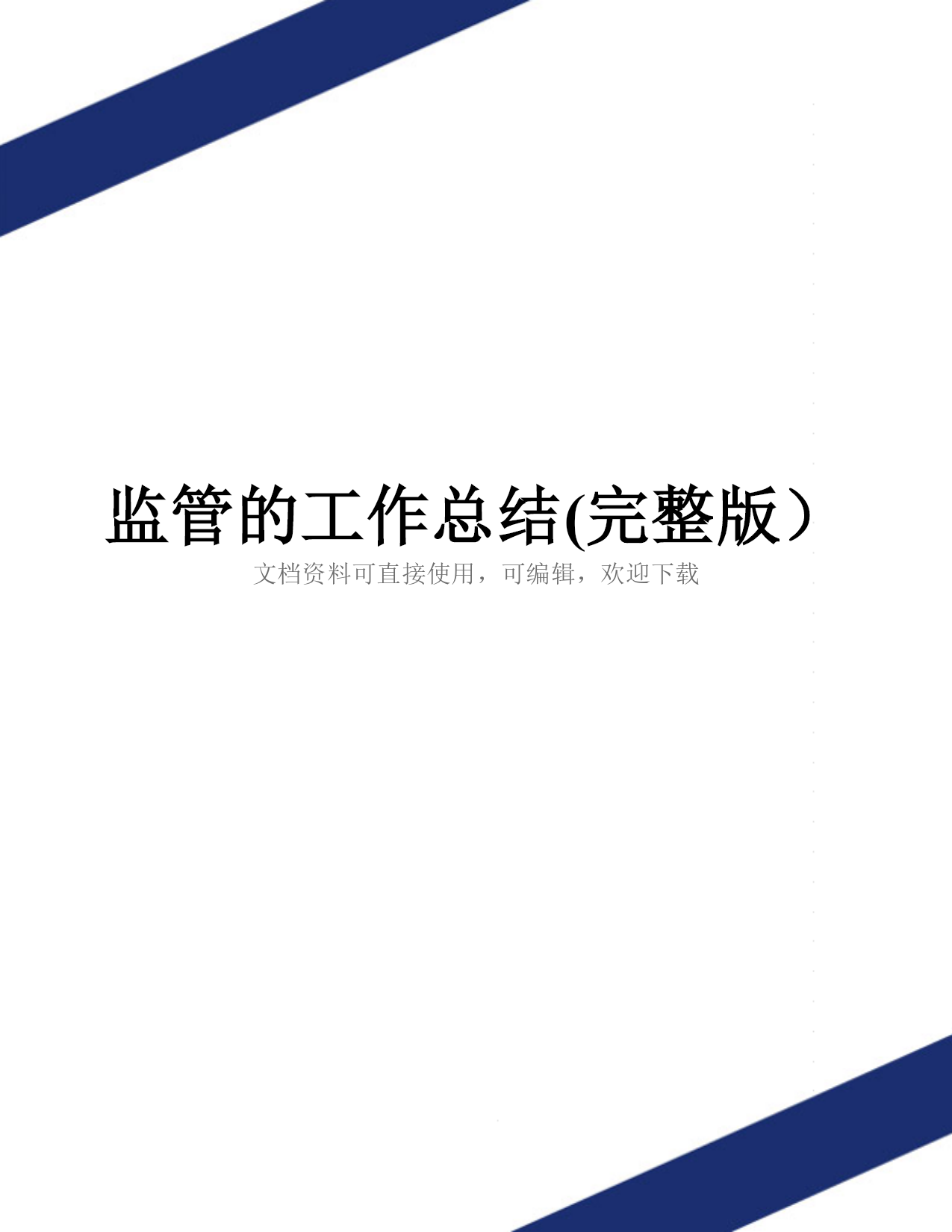 监管的工作总结(完整版)文档资料可直接使用,可编辑,欢迎下载监管的工作总结范文【范文一:质监局监管工作总结】今年以来,我局紧紧围绕“双提升、双创建”的工作思路,以提升行政监管能力和技术保障能力为重点,以创建国内一流质量监管体系和检验检测体系为目标,创新工作思路,完善工作机制,狠抓工作落实,较好地完成上半年各项工作任务。现将上半年工作总结汇报如下:一、___年工作情况(一)突出重点,推进质量强市建设。年初我局对质量强市工作进行了再部署,进一步明确工作重点,要求全体干部职工继续围绕质量强市这条主线,为创建全国