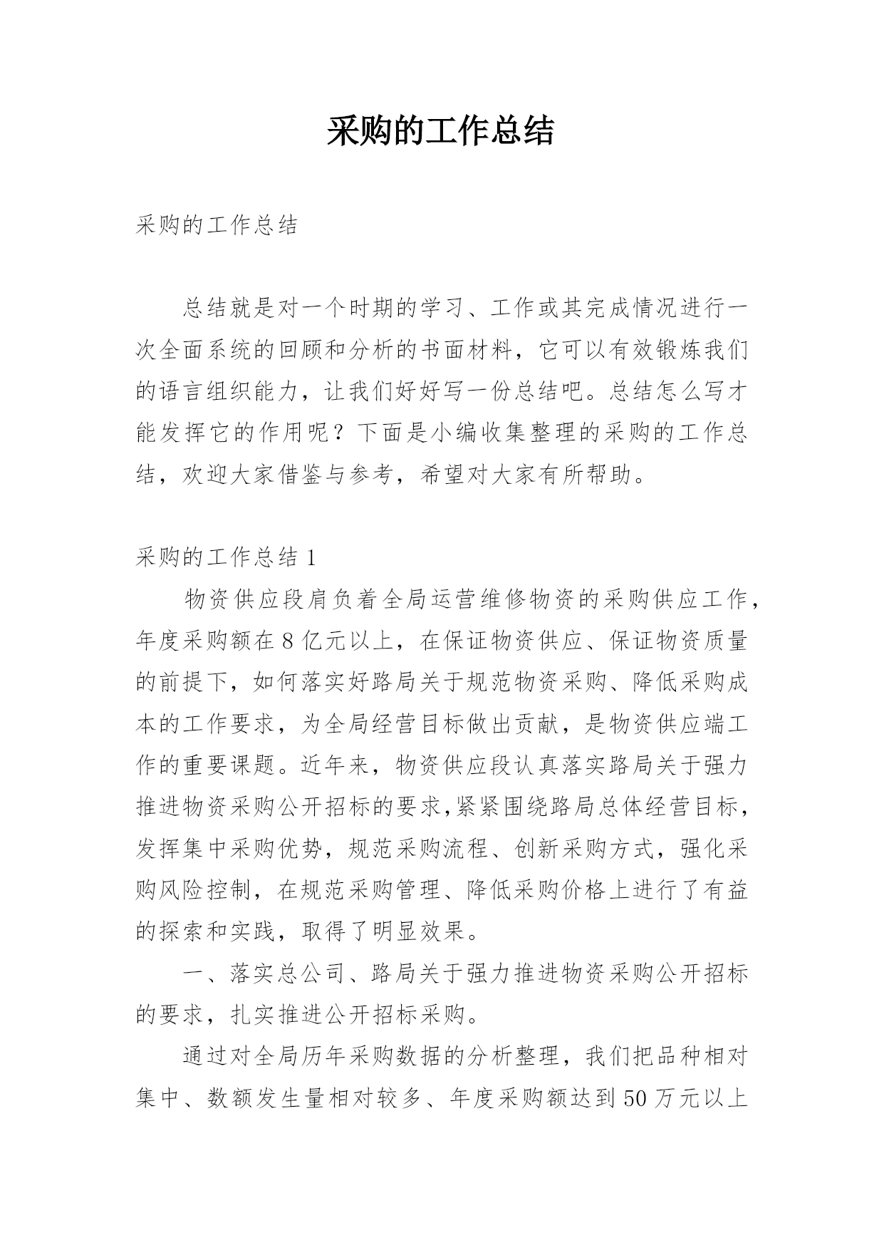 采购的工作总结采购的工作总结总结就是对一个时期的学习、工作或其完成情况进行一次全面系统的回顾和分析的书面材料,它可以有效锻炼我们的语言组织能力,让我们好好写一份总结吧。总结怎么写才能发挥它的作用呢?下面是小编收集整理的采购的工作总结,欢迎大家借鉴与参考,希望对大家有所帮助。采购的工作总结1物资供应段肩负着全局运营维修物资的采购供应工作,年度采购额在8亿元以上,在保证物资供应、保证物资质量的前提下,如何落实好路局关于规范物资采购、降低采购成本的工作要求,为全局经营目标做出贡献,是物资供应端工作的重要课题。近