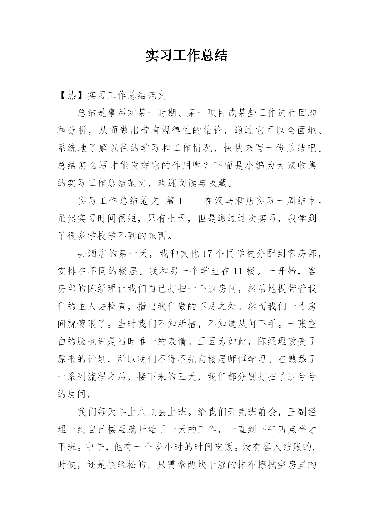 实习工作总结【热】实习工作总结范文总结是事后对某一时期、某一项目或某些工作进行回顾和分析,从而做出带有规律性的结论,通过它可以全面地、系统地了解以往的学习和工作情况,快快来写一份总结吧。总结怎么写才能发挥它的作用呢?下面是小编为大家收集的实习工作总结范文,欢迎阅读与收藏。实习工作总结范文篇1在汉马酒店实习一周结束。虽然实习时间很短,只有七天,但是通过这次实习,我学到了很多学校学不到的东西。去酒店的第一天,我和其他17个同学被分配到客房部,安排在不同的楼层。我和另一个学生在11楼。一开始,客房部的陈经理让我