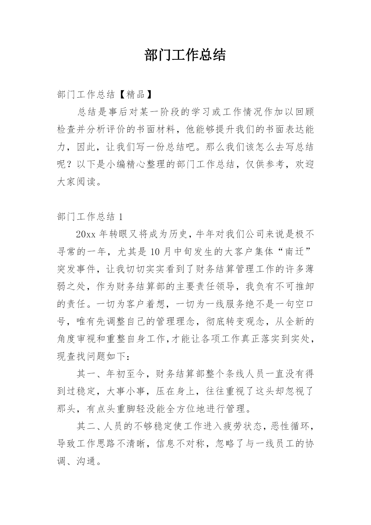 部门工作总结部门工作总结【精品】总结是事后对某一阶段的学习或工作情况作加以回顾检查并分析评价的书面材料,他能够提升我们的书面表达能力,因此,让我们写一份总结吧。那么我们该怎么去写总结呢?以下是小编精心整理的部门工作总结,仅供参考,欢迎大家阅读。部门工作总结120xx年转眼又将成为历史,牛年对我们公司来说是极不寻常的一年,尤其是10月中旬发生的大客户集体“南迁”突发事件,让我切切实实看到了财务结算管理工作的许多薄弱之处,作为财务结算部的主要责任领导,我负有不可推卸的责任。一切为客户着想,一切为一线服务绝不是