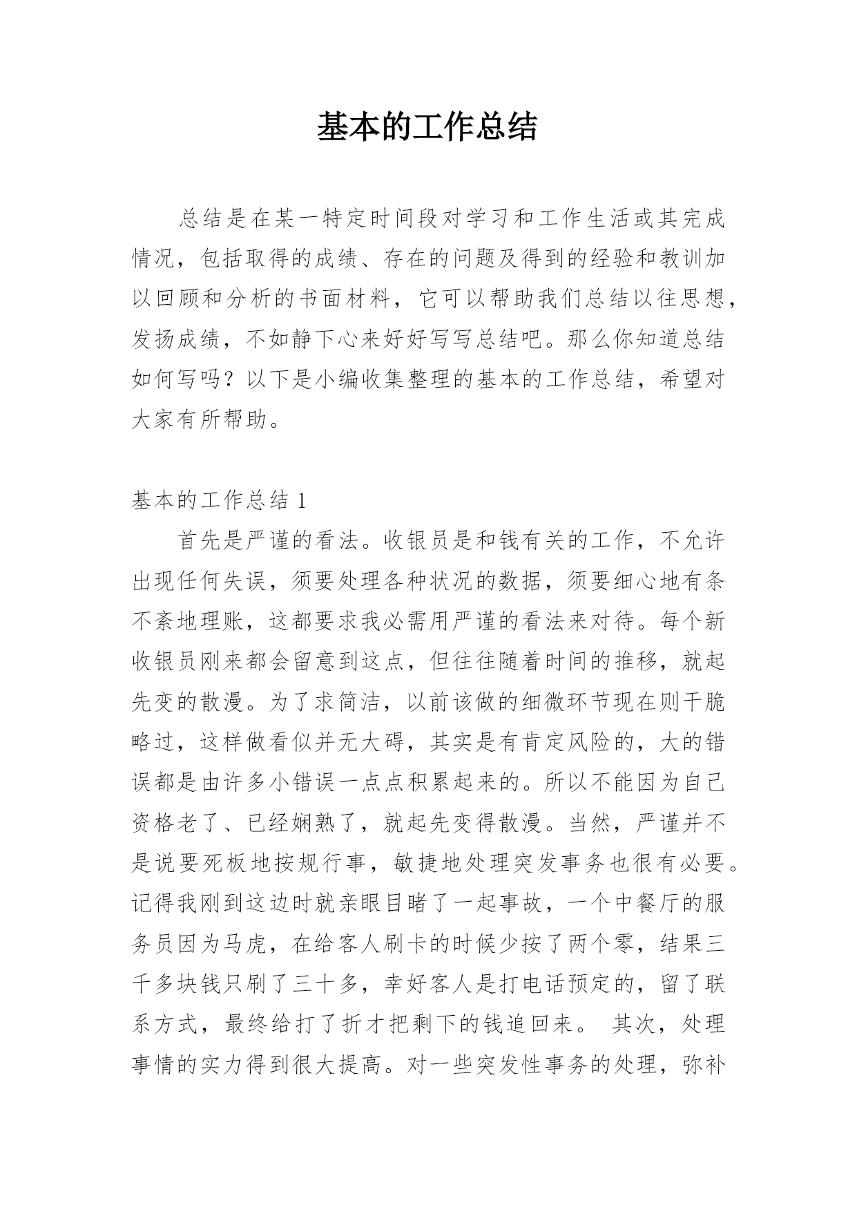 基本的工作总结总结是在某一特定时间段对学习和工作生活或其完成情况,包括取得的成绩、存在的问题及得到的经验和教训加以回顾和分析的书面材料,它可以帮助我们总结以往思想,发扬成绩,不如静下心来好好写写总结吧。那么你知道总结如何写吗?以下是小编收集整理的基本的工作总结,希望对大家有所帮助。基本的工作总结1首先是严谨的看法。收银员是和钱有关的工作,不允许出现任何失误,须要处理各种状况的数据,须要细心地有条不紊地理账,这都要求我必需用严谨的看法来对待。每个新收银员刚来都会留意到这点,但往往随着时间的推移,就起先变的散