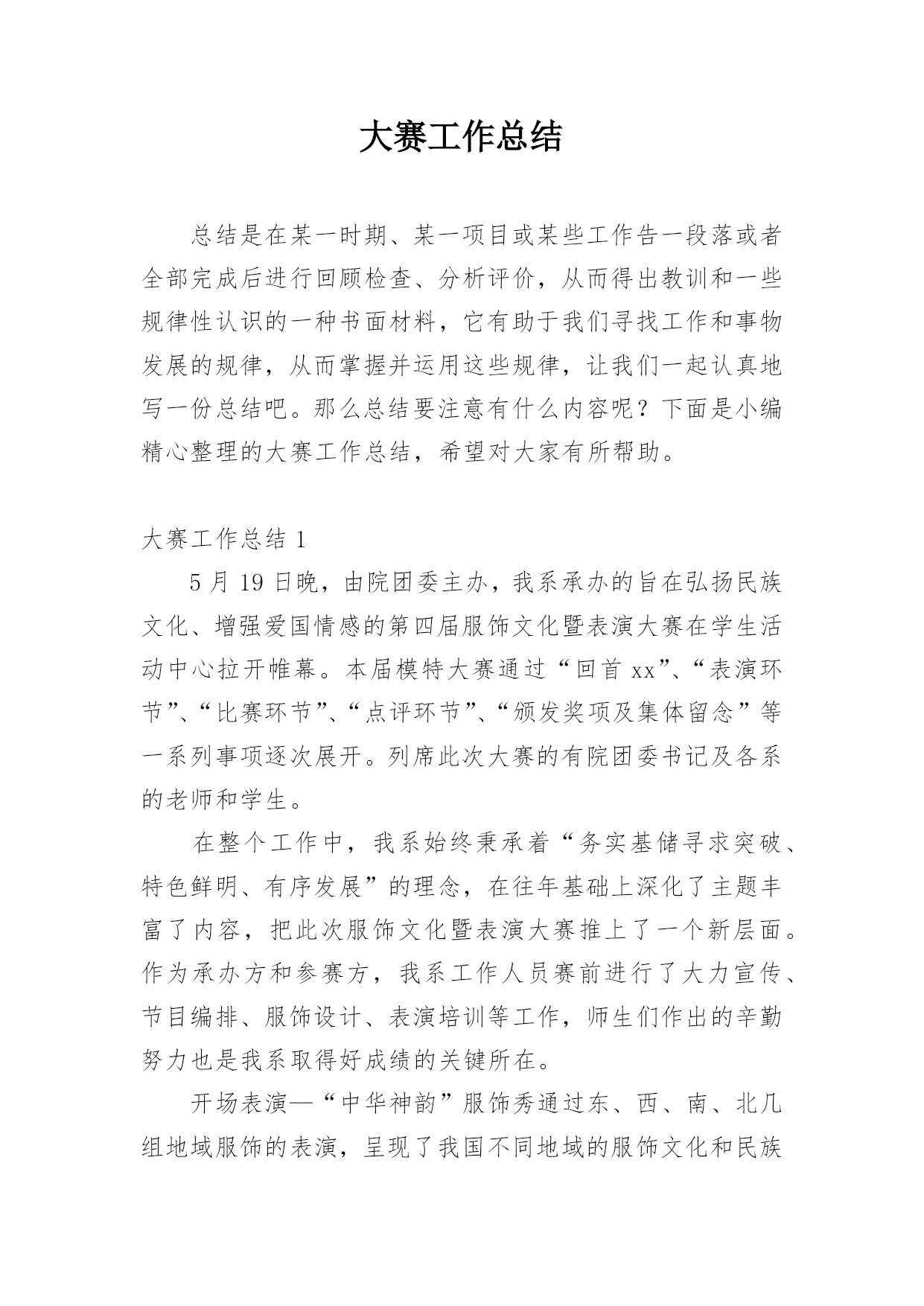 大赛工作总结总结是在某一时期、某一项目或某些工作告一段落或者全部完成后进行回顾检查、分析评价,从而得出教训和一些规律性认识的一种书面材料,它有助于我们寻找工作和事物发展的规律,从而掌握并运用这些规律,让我们一起认真地写一份总结吧。那么总结要注意有什么内容呢?下面是小编精心整理的大赛工作总结,希望对大家有所帮助。大赛工作总结15月19日晚,由院团委主办,我系承办的旨在弘扬民族文化、增强爱国情感的第四届服饰文化暨表演大赛在学生活动中心拉开帷幕。本届模特大赛通过“回首xx”、“表演环节”、“比赛环节”、“点评环