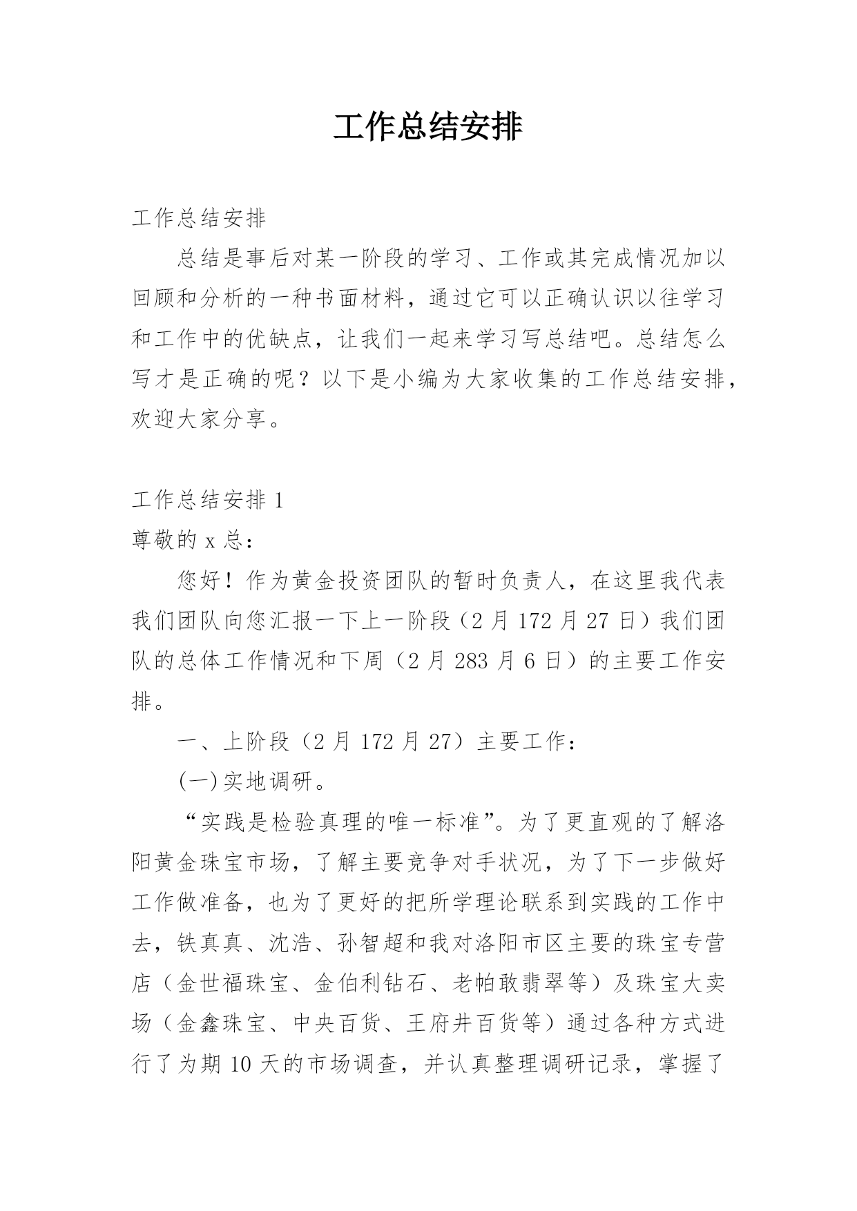 工作总结安排工作总结安排总结是事后对某一阶段的学习、工作或其完成情况加以回顾和分析的一种书面材料,通过它可以正确认识以往学习和工作中的优缺点,让我们一起来学习写总结吧。总结怎么写才是正确的呢?以下是小编为大家收集的工作总结安排,欢迎大家分享。工作总结安排1尊敬的x总:您好!作为黄金投资团队的暂时负责人,在这里我代表我们团队向您汇报一下上一阶段(2月172月27日)我们团队的总体工作情况和下周(2月283月6日)的主要工作安排。一、上阶段(2月172月27)主要工作:(一)实地调研。“实践是检验真理的唯一标
