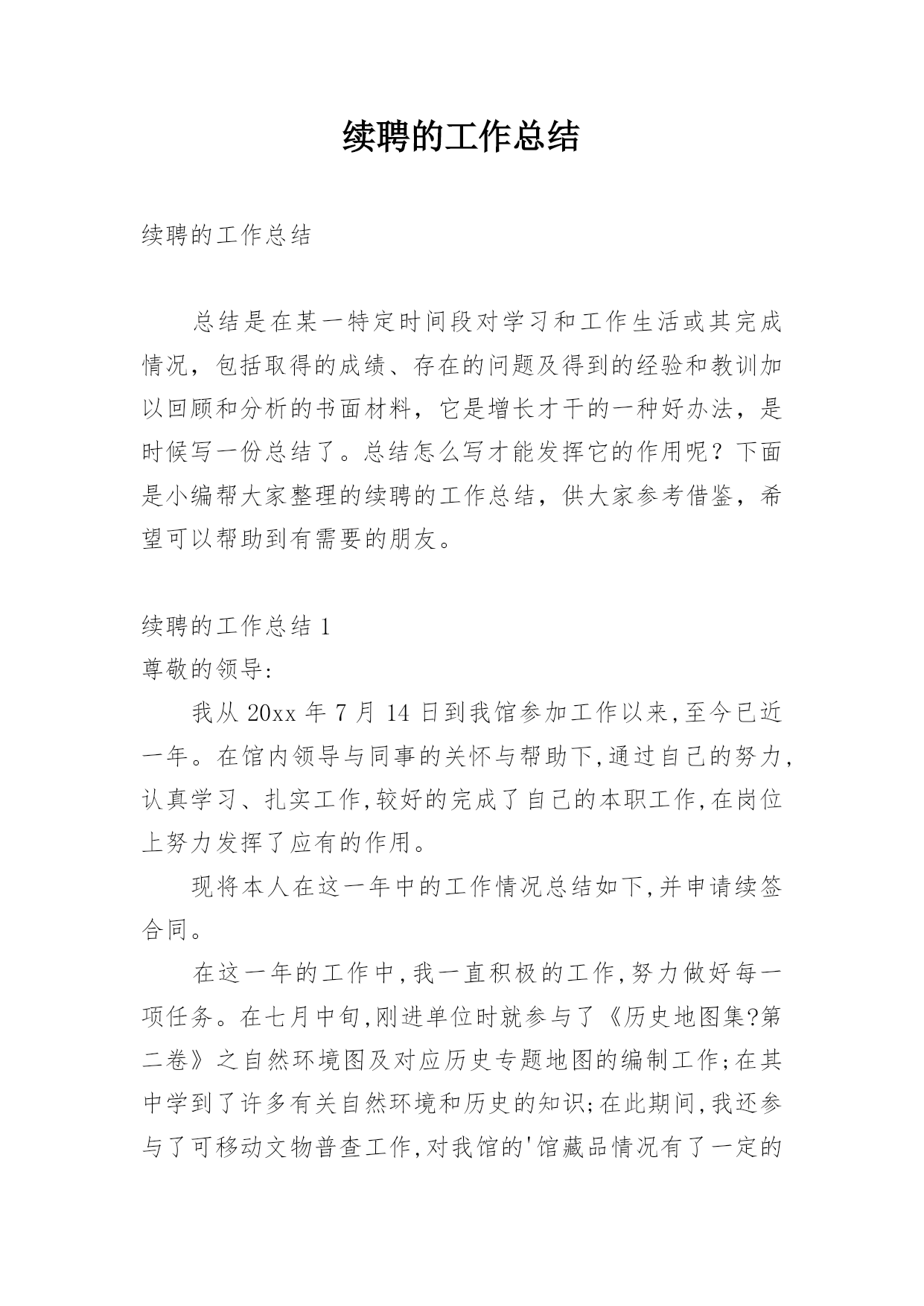 续聘的工作总结续聘的工作总结总结是在某一特定时间段对学习和工作生活或其完成情况,包括取得的成绩、存在的问题及得到的经验和教训加以回顾和分析的书面材料,它是增长才干的一种好办法,是时候写一份总结了。总结怎么写才能发挥它的作用呢?下面是小编帮大家整理的续聘的工作总结,供大家参考借鉴,希望可以帮助到有需要的朋友。续聘的工作总结1尊敬的领导:我从20xx年7月14日到我馆参加工作以来,至今已近一年。在馆内领导与同事的关怀与帮助下,通过自己的努力,认真学习、扎实工作,较好的完成了自己的本职工作,在岗位上努力发挥了应