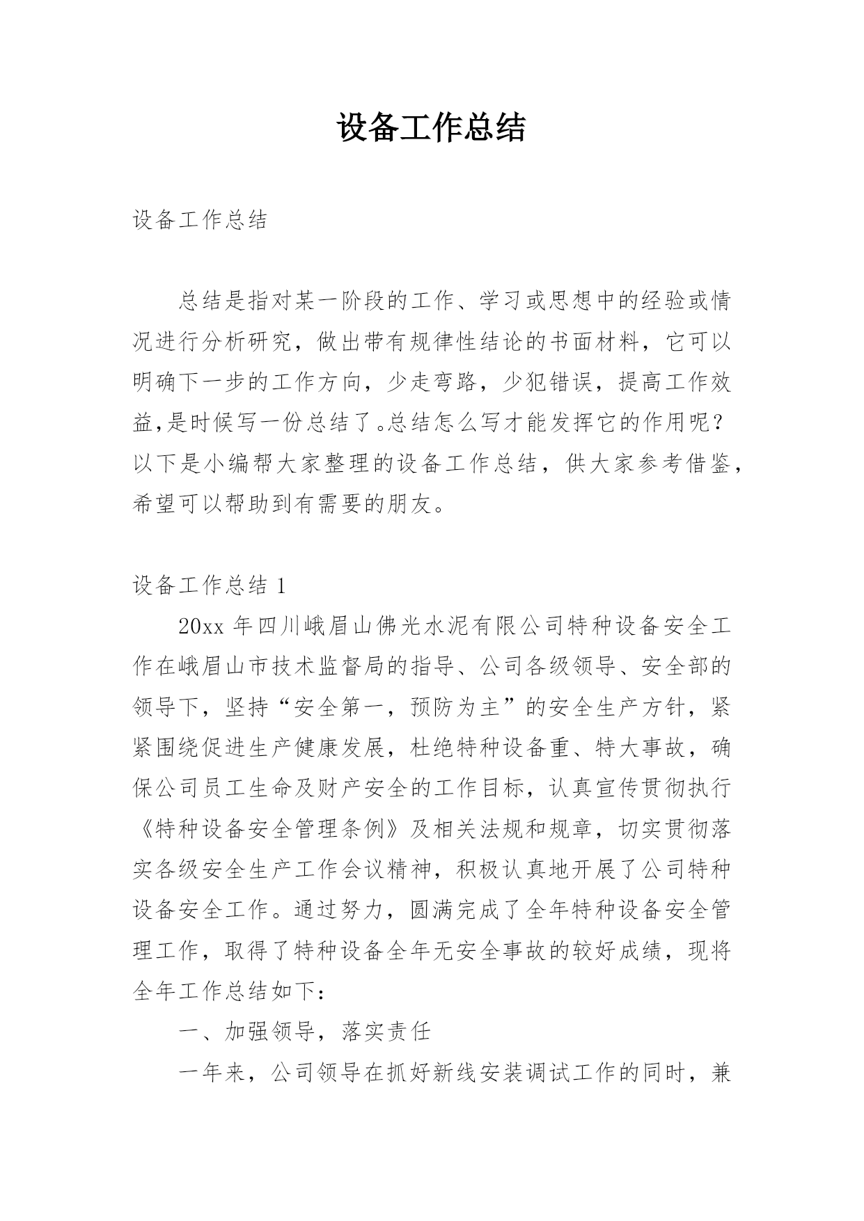 设备工作总结设备工作总结总结是指对某一阶段的工作、学习或思想中的经验或情况进行分析研究,做出带有规律性结论的书面材料,它可以明确下一步的工作方向,少走弯路,少犯错误,提高工作效益,是时候写一份总结了。总结怎么写才能发挥它的作用呢?以下是小编帮大家整理的设备工作总结,供大家参考借鉴,希望可以帮助到有需要的朋友。设备工作总结120xx年四川峨眉山佛光水泥有限公司特种设备安全工作在峨眉山市技术监督局的指导、公司各级领导、安全部的领导下,坚持“安全第一,预防为主”的安全生产方针,紧紧围绕促进生产健康发展,杜绝特种