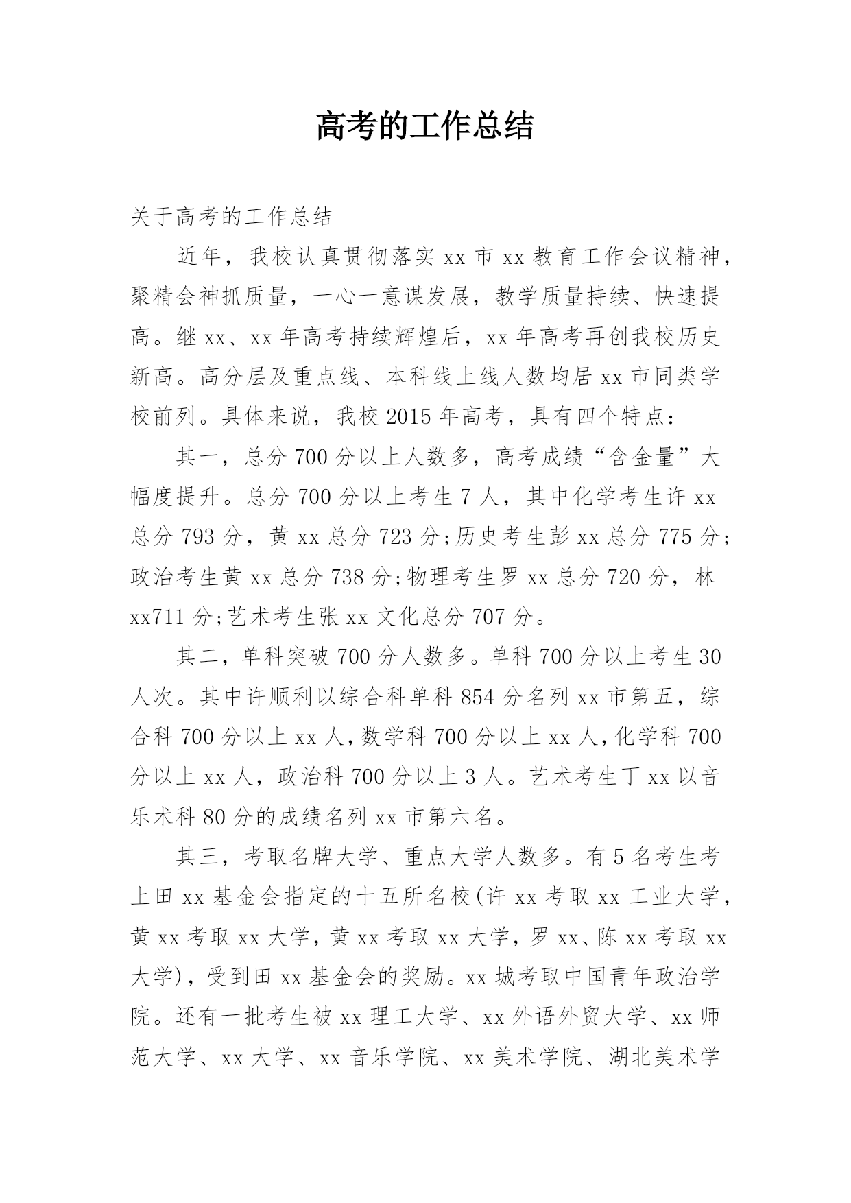 高考的工作总结关于高考的工作总结近年,我校认真贯彻落实xx市xx教育工作会议精神,聚精会神抓质量,一心一意谋发展,教学质量持续、快速提高。继xx、xx年高考持续辉煌后,xx年高考再创我校历史新高。高分层及重点线、本科线上线人数均居xx市同类学校前列。具体来说,我校2015年高考,具有四个特点:其一,总分700分以上人数多,高考成绩“含金量”大幅度提升。总分700分以上考生7人,其中化学考生许xx总分793分,黄xx总分723分;历史考生彭xx总分775分;政治考生黄xx总分738分;物理考生罗xx总分72