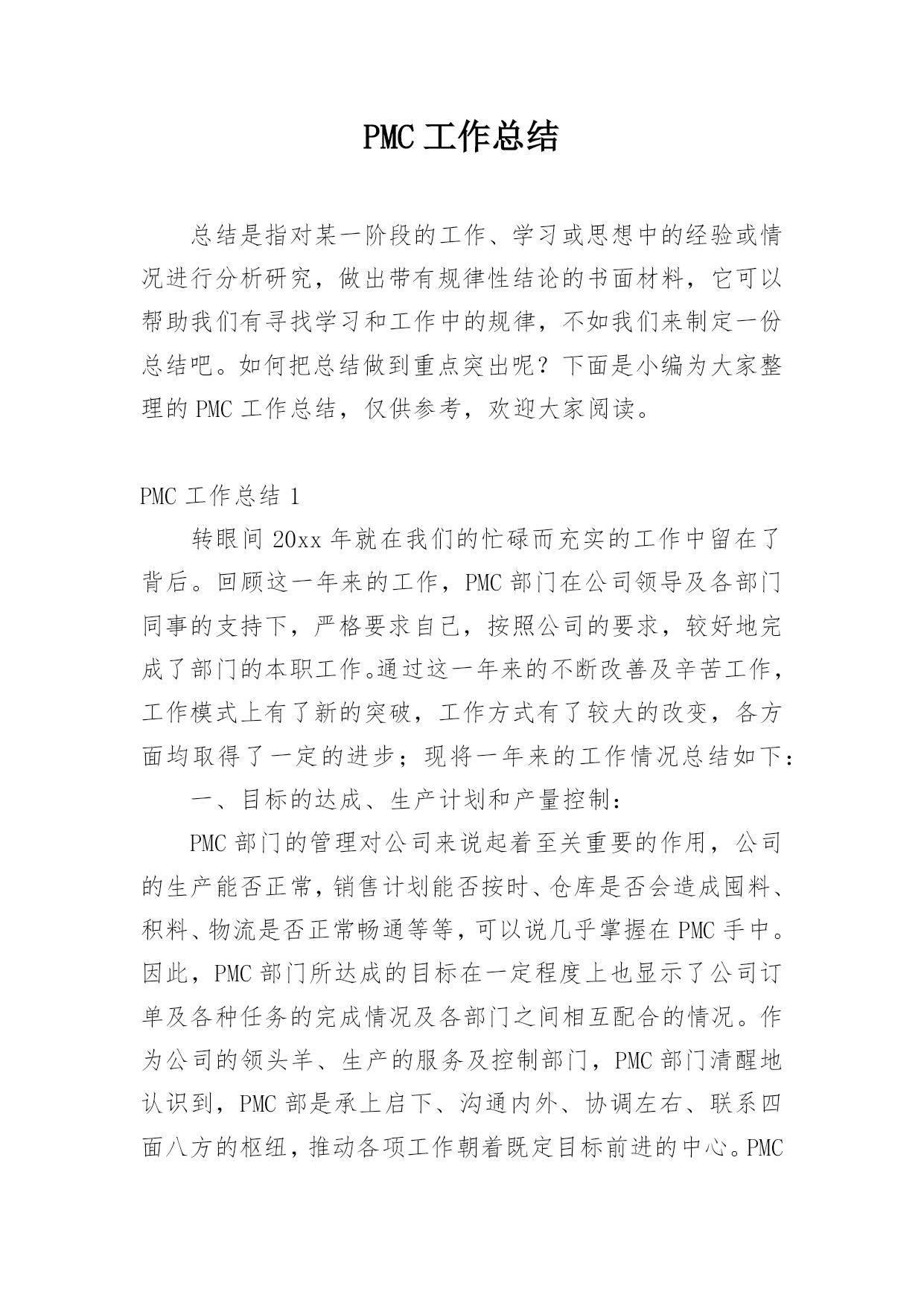 PMC工作总结总结是指对某一阶段的工作、学习或思想中的经验或情况进行分析研究,做出带有规律性结论的书面材料,它可以帮助我们有寻找学习和工作中的规律,不如我们来制定一份总结吧。如何把总结做到重点突出呢?下面是小编为大家整理的PMC工作总结,仅供参考,欢迎大家阅读。PMC工作总结1转眼间20xx年就在我们的忙碌而充实的工作中留在了背后。回顾这一年来的工作,PMC部门在公司领导及各部门同事的支持下,严格要求自己,按照公司的要求,较好地完成了部门的本职工作。通过这一年来的不断改善及辛苦工作,工作模式上有了新的突破