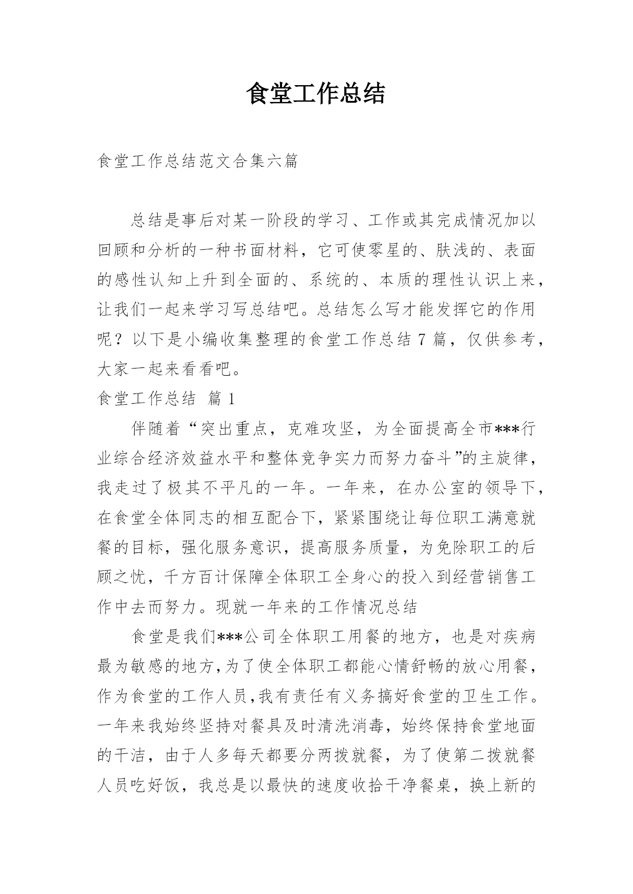 食堂工作总结食堂工作总结范文合集六篇总结是事后对某一阶段的学习、工作或其完成情况加以回顾和分析的一种书面材料,它可使零星的、肤浅的、表面的感性认知上升到全面的、系统的、本质的理性认识上来,让我们一起来学习写总结吧。总结怎么写才能发挥它的作用呢?以下是小编收集整理的食堂工作总结7篇,仅供参考,大家一起来看看吧。食堂工作总结篇1伴随着“突出重点,克难攻坚,为全面提高全市***行业综合经济效益水平和整体竞争实力而努力奋斗”的主旋律,我走过了极其不平凡的一年。一年来,在办公室的领导下,在食堂全体同志的相互配合下,