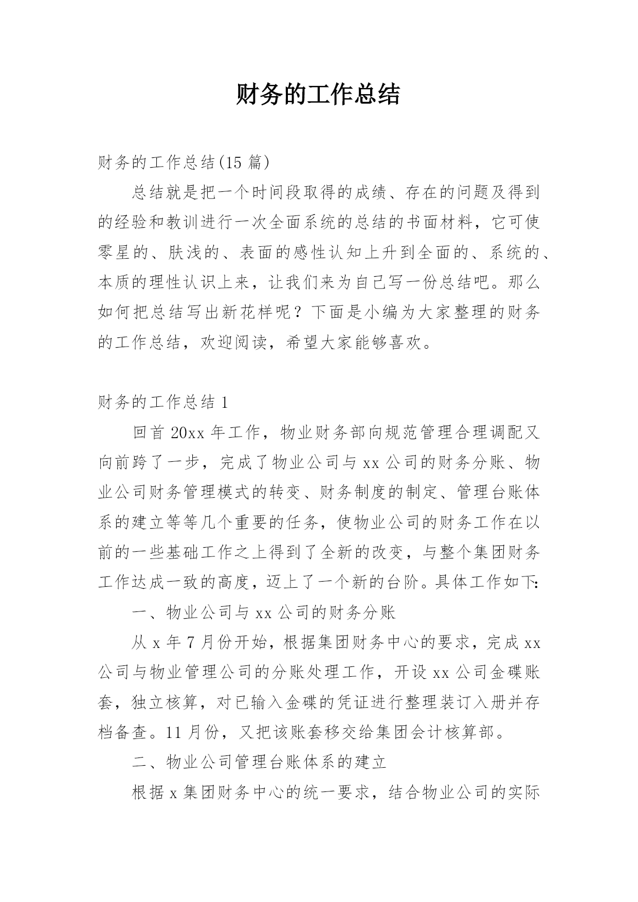 财务的工作总结财务的工作总结(15篇)总结就是把一个时间段取得的成绩、存在的问题及得到的经验和教训进行一次全面系统的总结的书面材料,它可使零星的、肤浅的、表面的感性认知上升到全面的、系统的、本质的理性认识上来,让我们来为自己写一份总结吧。那么如何把总结写出新花样呢?下面是小编为大家整理的财务的工作总结,欢迎阅读,希望大家能够喜欢。财务的工作总结1回首20xx年工作,物业财务部向规范管理合理调配又向前跨了一步,完成了物业公司与xx公司的财务分账、物业公司财务管理模式的转变、财务制度的制定、管理台账体系的建立