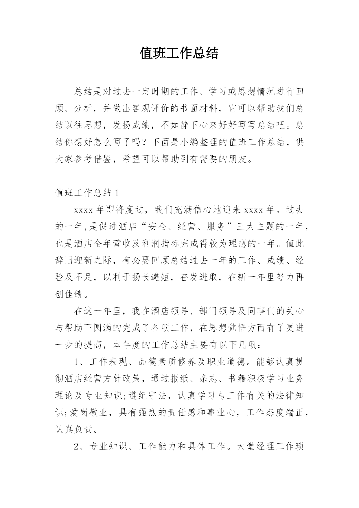 值班工作总结总结是对过去一定时期的工作、学习或思想情况进行回顾、分析,并做出客观评价的书面材料,它可以帮助我们总结以往思想,发扬成绩,不如静下心来好好写写总结吧。总结你想好怎么写了吗?下面是小编整理的值班工作总结,供大家参考借鉴,希望可以帮助到有需要的朋友。值班工作总结1xxxx年即将度过,我们充满信心地迎来xxxx年。过去的一年,是促进酒店“安全、经营、服务”三大主题的一年,也是酒店全年营收及利润指标完成得较为理想的一年。值此辞旧迎新之际,有必要回顾总结过去一年的工作、成绩、经验及不足,以利于扬长避短,