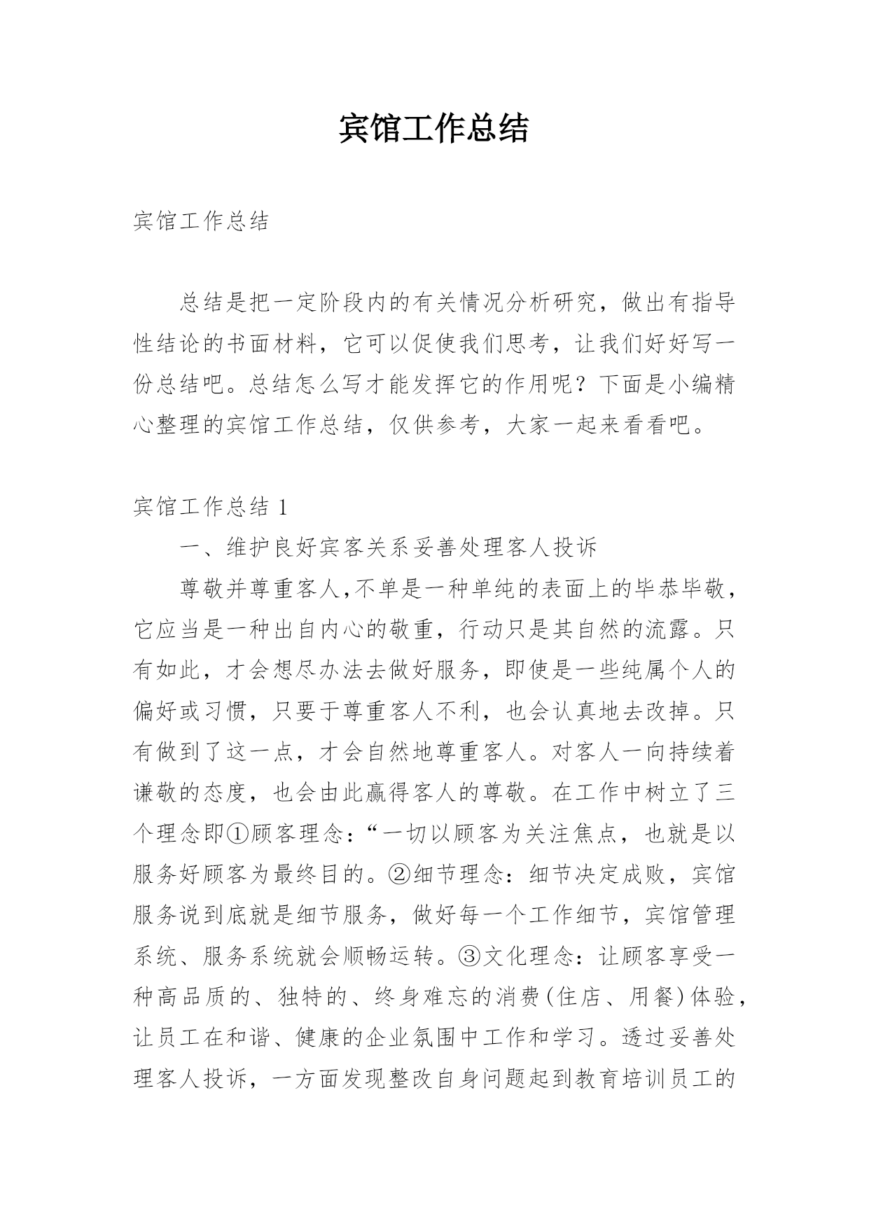 宾馆工作总结宾馆工作总结总结是把一定阶段内的有关情况分析研究,做出有指导性结论的书面材料,它可以促使我们思考,让我们好好写一份总结吧。总结怎么写才能发挥它的作用呢?下面是小编精心整理的宾馆工作总结,仅供参考,大家一起来看看吧。宾馆工作总结1一、维护良好宾客关系妥善处理客人投诉尊敬并尊重客人,不单是一种单纯的表面上的毕恭毕敬,它应当是一种出自内心的敬重,行动只是其自然的流露。只有如此,才会想尽办法去做好服务,即使是一些纯属个人的偏好或习惯,只要于尊重客人不利,也会认真地去改掉。只有做到了这一点,才会自然地尊