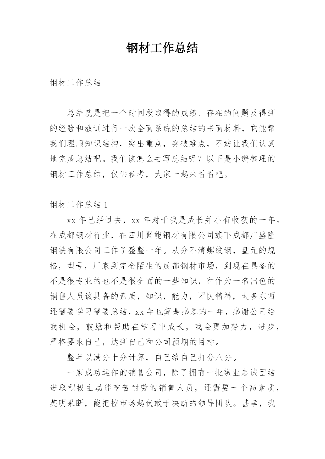 钢材工作总结钢材工作总结总结就是把一个时间段取得的成绩、存在的问题及得到的经验和教训进行一次全面系统的总结的书面材料,它能帮我们理顺知识结构,突出重点,突破难点,不妨让我们认真地完成总结吧。我们该怎么去写总结呢?以下是小编整理的钢材工作总结,仅供参考,大家一起来看看吧。钢材工作总结1xx年已经过去,xx年对于我是成长并小有收获的一年。在成都钢材行业,在四川聚能钢材有限公司旗下成都广盛隆钢铁有限公司工作了整整一年。从分不清螺纹钢,盘元的规格,型号,厂家到完全陌生的成都钢材市场,到现在具备的不是很专业的也不是
