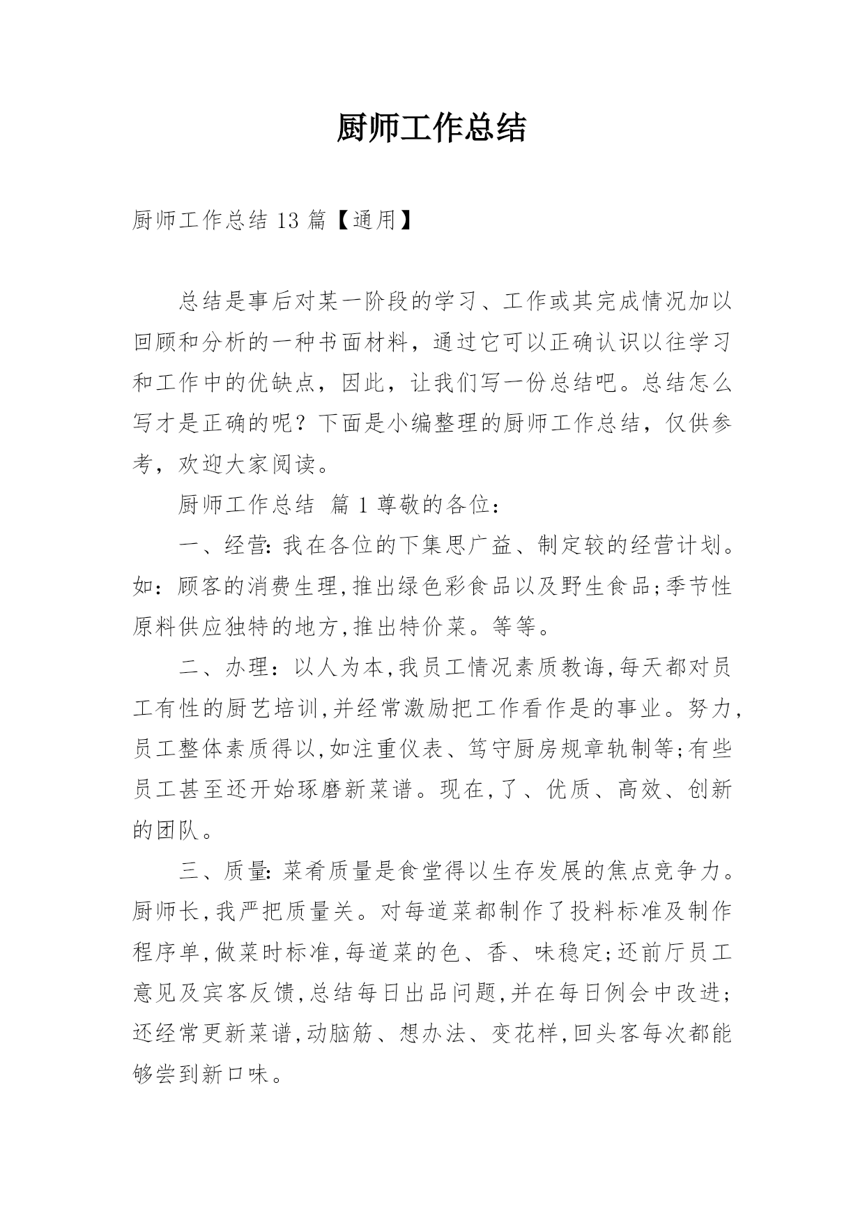 厨师工作总结厨师工作总结13篇【通用】总结是事后对某一阶段的学习、工作或其完成情况加以回顾和分析的一种书面材料,通过它可以正确认识以往学习和工作中的优缺点,因此,让我们写一份总结吧。总结怎么写才是正确的呢?下面是小编整理的厨师工作总结,仅供参考,欢迎大家阅读。厨师工作总结篇1尊敬的各位:一、经营:我在各位的下集思广益、制定较的经营计划。如:顾客的消费生理,推出绿色彩食品以及野生食品;季节性原料供应独特的地方,推出特价菜。等等。二、办理:以人为本,我员工情况素质教诲,每天都对员工有性的厨艺培训,并经常激励把