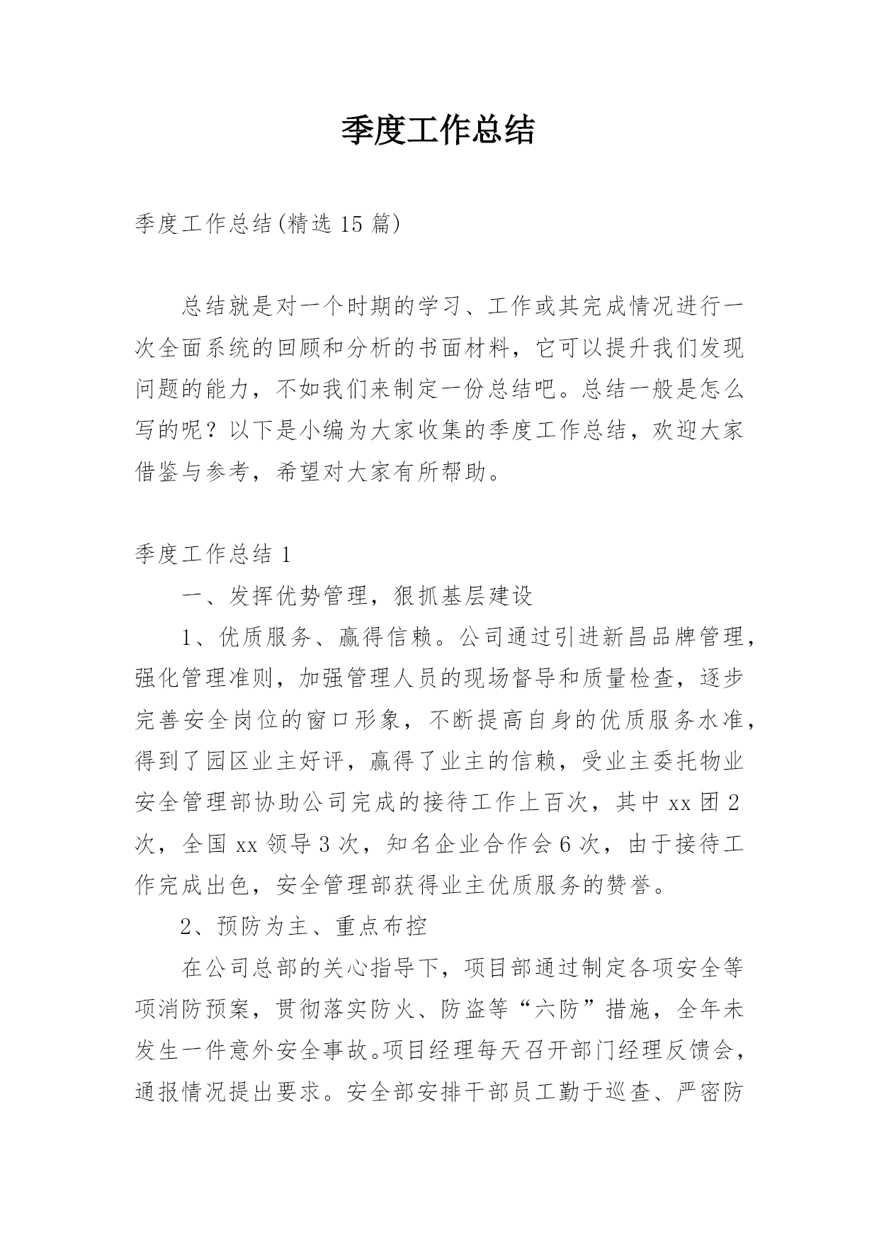 季度工作总结季度工作总结(精选15篇)总结就是对一个时期的学习、工作或其完成情况进行一次全面系统的回顾和分析的书面材料,它可以提升我们发现问题的能力,不如我们来制定一份总结吧。总结一般是怎么写的呢?以下是小编为大家收集的季度工作总结,欢迎大家借鉴与参考,希望对大家有所帮助。季度工作总结1一、发挥优势管理,狠抓基层建设1、优质服务、赢得信赖。公司通过引进新昌品牌管理,强化管理准则,加强管理人员的现场督导和质量检查,逐步完善安全岗位的窗口形象,不断提高自身的优质服务水准,得到了园区业主好评,赢得了业主的信赖,