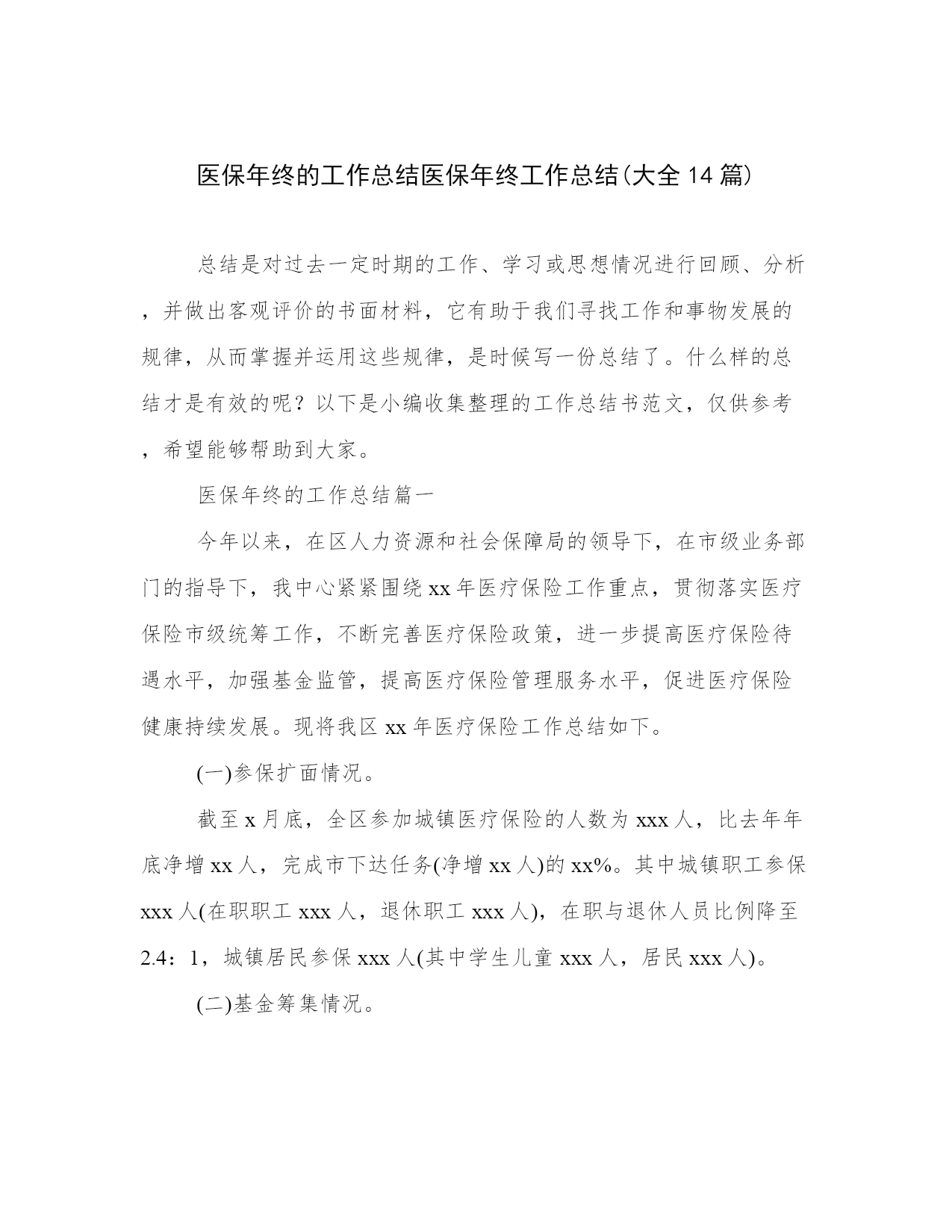 医保年终的工作总结医保年终工作总结(大全14篇)总结是对过去一定时期的工作、学习或思想情况进行回顾、分析,并做出客观评价的书面材料,它有助于我们寻找工作和事物发展的规律,从而掌握并运用这些规律,是时候写一份总结了。什么样的总结才是有效的呢?以下是小编收集整理的工作总结书范文,仅供参考,希望能够帮助到大家。医保年终的工作总结篇一今年以来,在区人力资源和社会保障局的领导下,在市级业务部门的指导下,我中心紧紧围绕xx年医疗保险工作重点,贯彻落实医疗保险市级统筹工作,不断完善医疗保险政策,进一步提高医疗保险待遇水