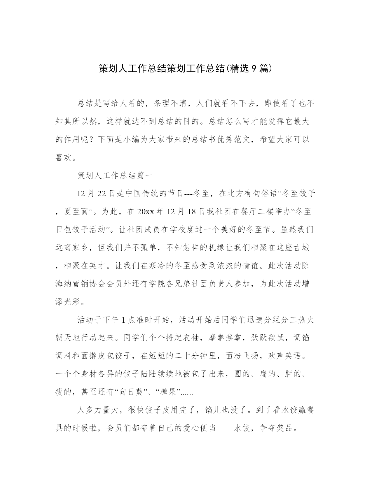 策划人工作总结策划工作总结(精选9篇)总结是写给人看的,条理不清,人们就看不下去,即使看了也不知其所以然,这样就达不到总结的目的。总结怎么写才能发挥它最大的作用呢?下面是小编为大家带来的总结书优秀范文,希望大家可以喜欢。策划人工作总结篇一12月22日是中国传统的节日---冬至,在北方有句俗语“冬至饺子,夏至面”。为此,在20xx年12月18日我社团在餐厅二楼举办“冬至日包饺子活动”。让社团成员在学校度过一个美好的冬至节。虽然我们远离家乡,但我们并不孤单,不知怎样的机缘让我们相聚在这座古城,相聚在英才。让我