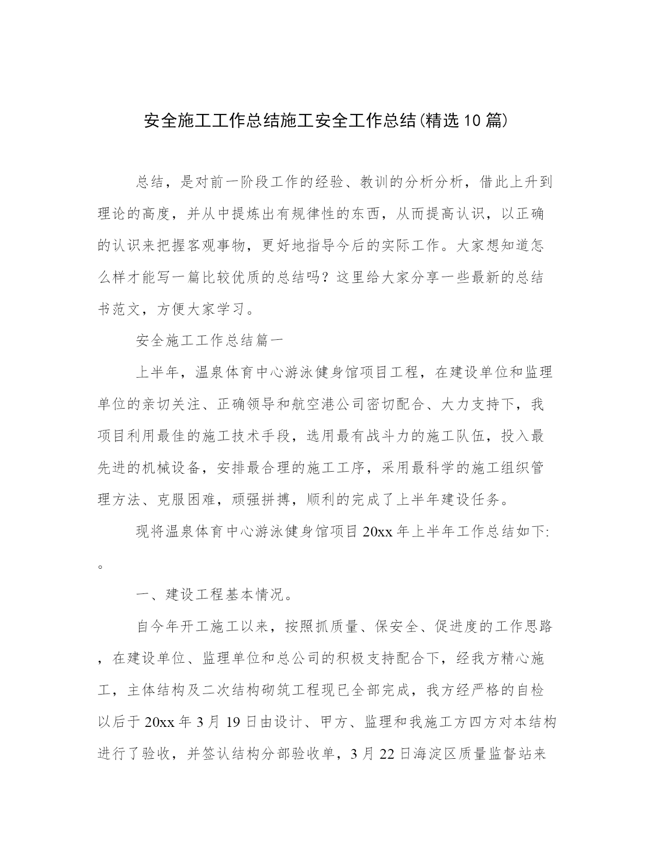 安全施工工作总结施工安全工作总结(精选10篇).docx