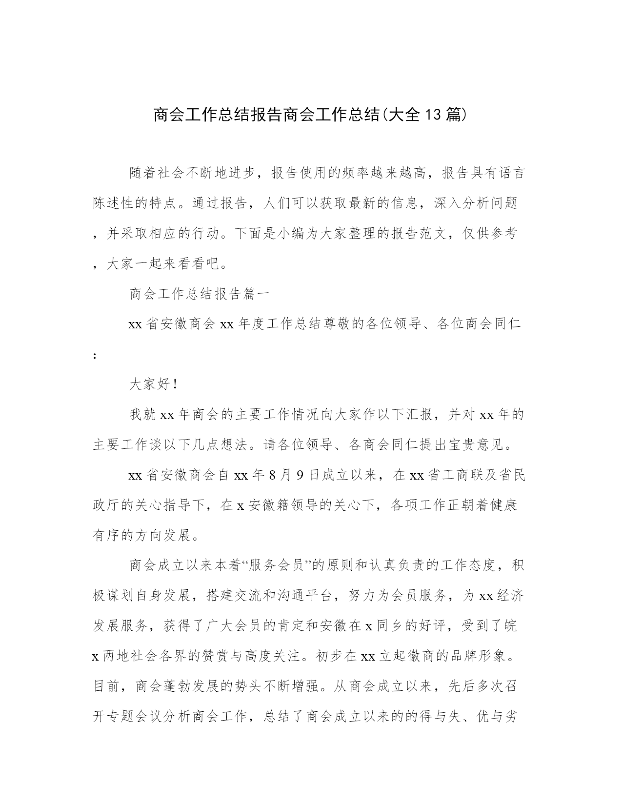 商会工作总结报告商会工作总结(大全13篇)随着社会不断地进步,报告使用的频率越来越高,报告具有语言陈述性的特点。通过报告,人们可以获取最新的信息,深入分析问题,并采取相应的行动。下面是小编为大家整理的报告范文,仅供参考,大家一起来看看吧。商会工作总结报告篇一xx省安徽商会xx年度工作总结尊敬的各位领导、各位商会同仁:大家好!我就xx年商会的主要工作情况向大家作以下汇报,并对xx年的主要工作谈以下几点想法。请各位领导、各商会同仁提出宝贵意见。xx省安徽商会自xx年8月9日成立以来,在xx省工商联及省民政厅的